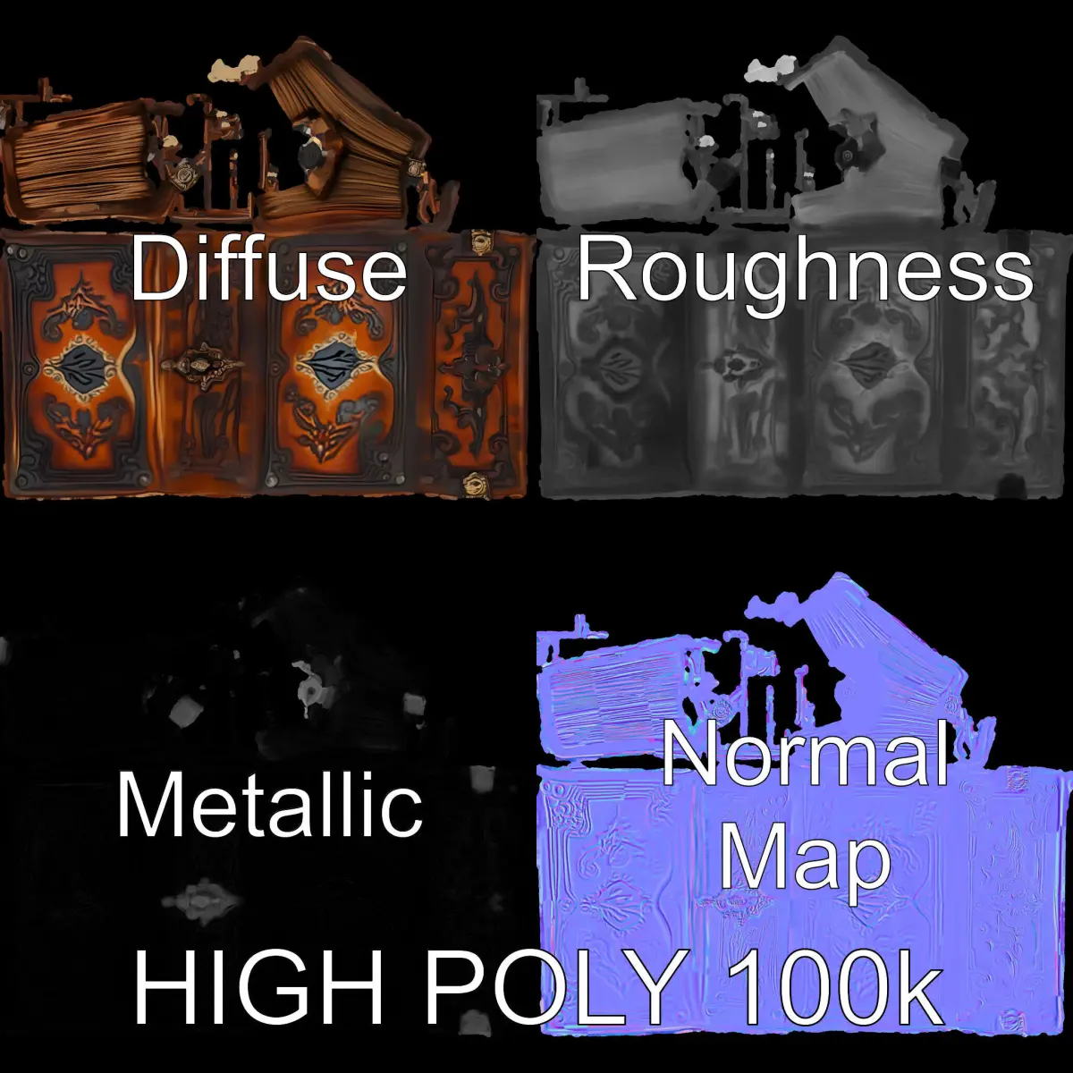 This 3D model pack features an ornately designed antique book with intricate detailing, offering three levels of detail: low (1000 triangles), middle (10,000 triangles), and high (100,000 triangles). It's perfect for enhancing visual storytelling in fantasy games, historical simulators, or virtual libraries. Compatible with 3ds Max, Maya, Cinema4D, Blender, Unity, and Unreal, it offers versatile use across production rendering, game engines, and interactive presentations. Textures include PBR, Diffuse, NormalMap, and reflection/roughness/metallic, with a resolution of 4096*4096 for high-quality rendering. The model is accurately unwrapped with no overlapping UVs. The first image is the reference used for creating the 3D model. It is important to carefully evaluate the quality of the model by examining the preview images that display the topology and polygonal mesh. These previews (WIRE and WEB 3D Preview) clearly demonstrate how accurately the model matches the original reference and how well the geometry has been executed. Please like and leave a comment if you enjoy this model.