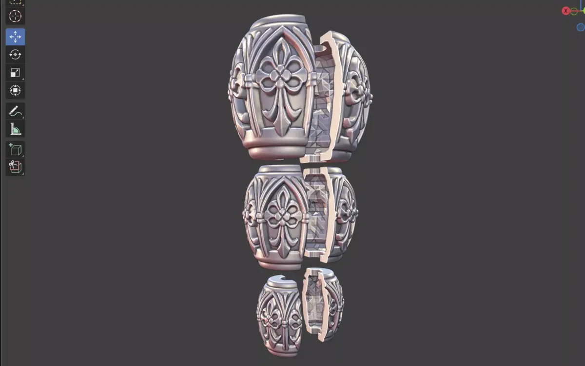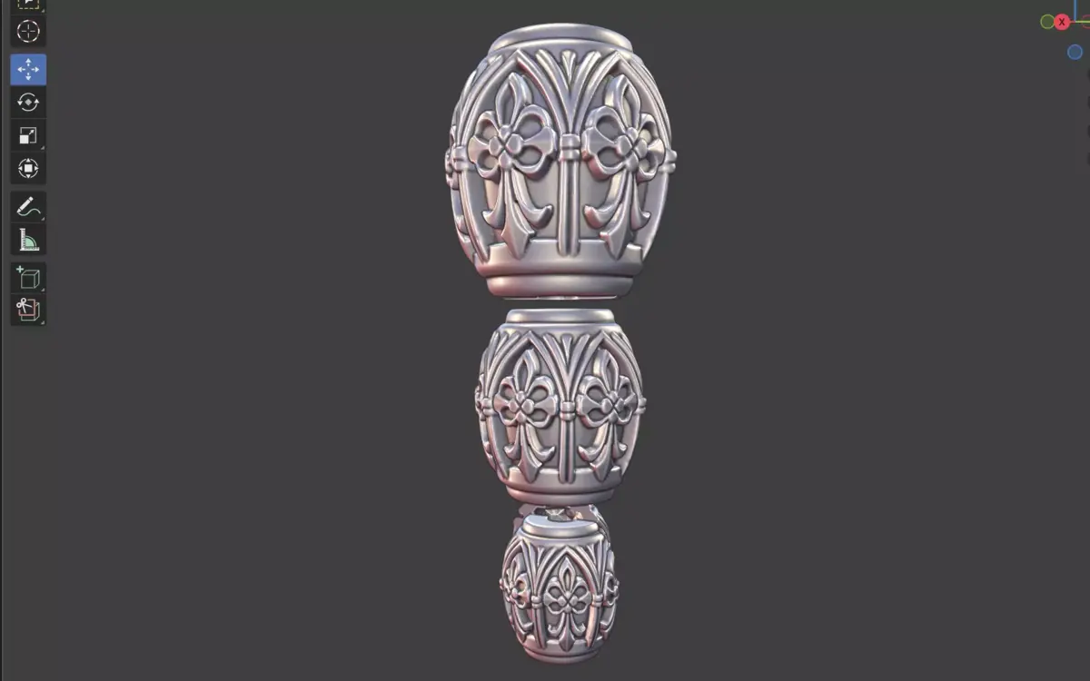 This ornate bead design features intricate carved patterns and flowing decorative motifs that create a rich, elegant surface aesthetic. Each bead is modeled with clean geometry and crisp relief details, bringing depth and visual interest suitable for fine jewelry, accessories, and artisanal craft projects.