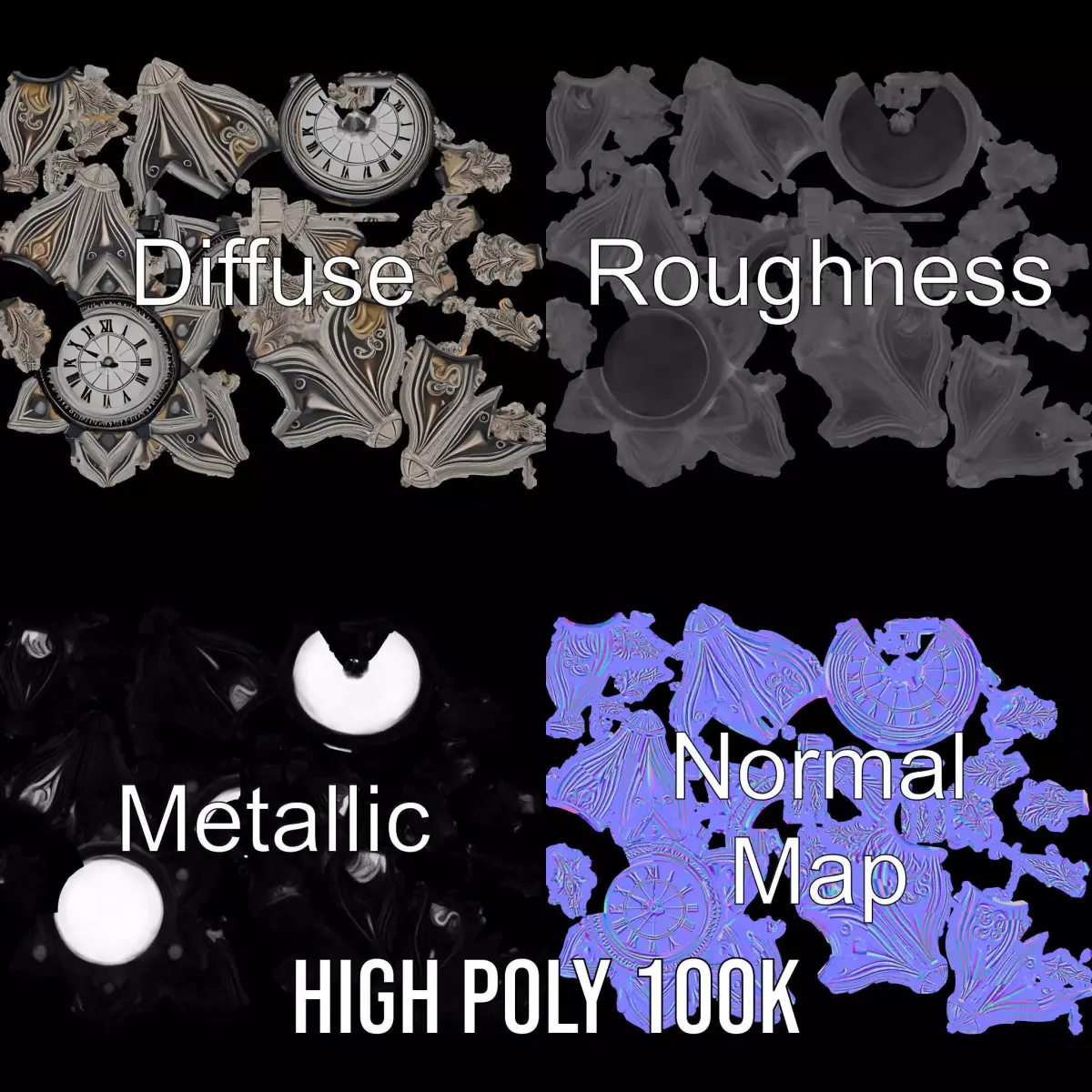 The Ornate Brass Clock model pack features an elegant star-shaped design with detailed patterns and a central clock face, perfect for antique or steampunk themes. Each model has 3 levels of detail: low-poly (1000 triangles for mobile), middle-poly (10 000 triangles for environment), and high-poly (100 000 triangles), which allows for the use of this model in production rendering(such as 3ds max, Maya, Cinema4d, Blender, Vray/Corona/Cycles, and all other), game engines (Unity and Unreal compatible), and interactive presentations, providing a choice of detail based on the LOD System principle. Ideal for use in video games, film sets, and interactive digital museums, adding a touch of sophistication to any environment. The model's textures are PBR, Diffuse, NormalMap, and reflection/roughness/metallic, which are suitable for any modern rendering engine. All models are accurately unwrapped and have no overlapping UVs. All textures are 4096*4096 in size. If you like this model, please like and leave a comment. Your feedback is appreciated!
