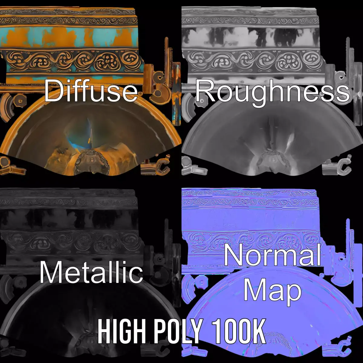 This Ornate Bronze Bell model features intricate decorative elements and a vintage patina finish, perfect for historical and fantasy visualizations. Each model has 3 levels of detail: low-poly (1000 triangles for mobile), middle-poly (10,000 triangles for environment), and high-poly (100,000 triangles), which allows for the use of this model in production rendering (such as 3ds Max, Maya, Cinema4D, Blender, Vray/Corona/Cycles and all others), game engines (Unity and Unreal compatible), and interactive presentations, providing a choice of detail based on the LOD System principle. Ideal for animation, game worlds, and architectural renderings. The model's textures are PBR, Diffuse, NormalMap, and reflection/roughness/metallic, which are suitable for any modern rendering engine. All models are accurately unwrapped and have no overlapping UV. All textures are 4096*4096 in size. Please like and leave a comment for the model if you enjoyed it.
