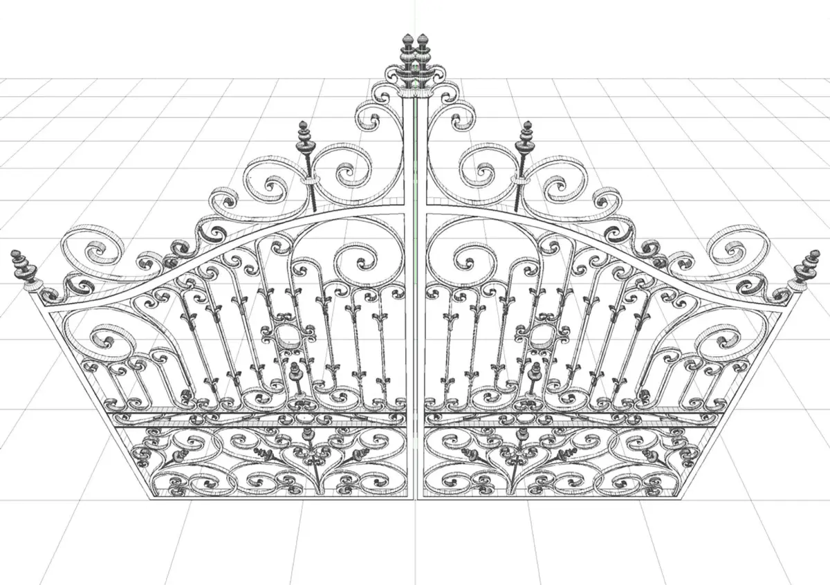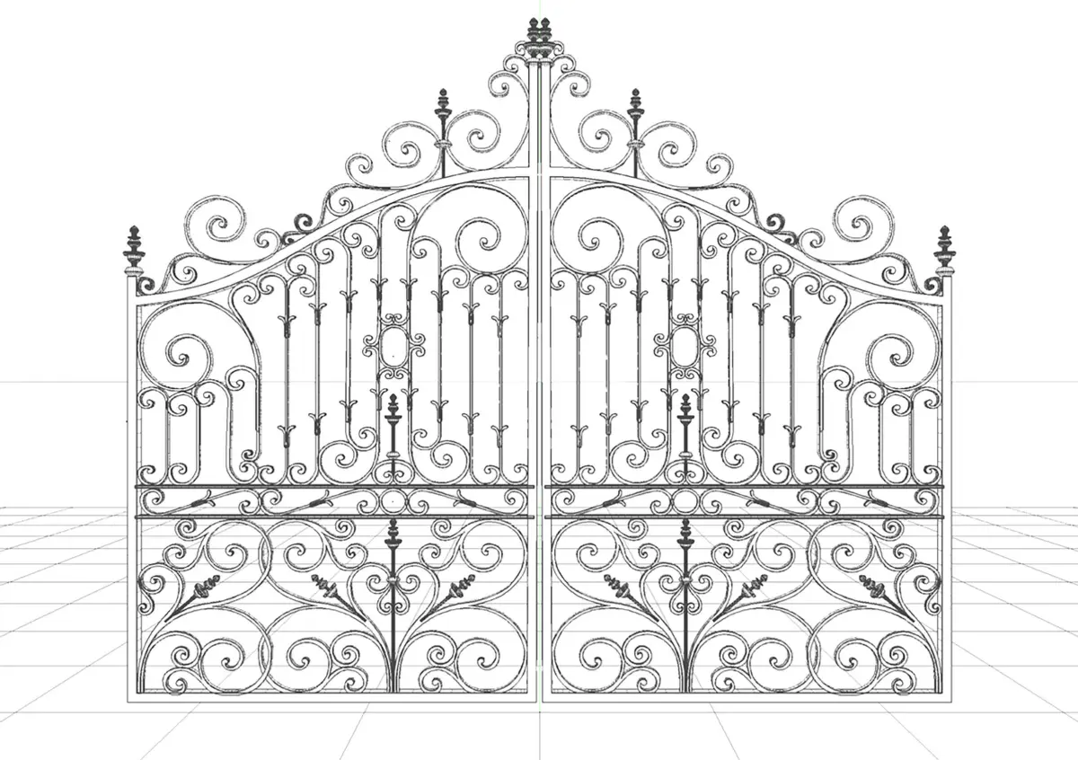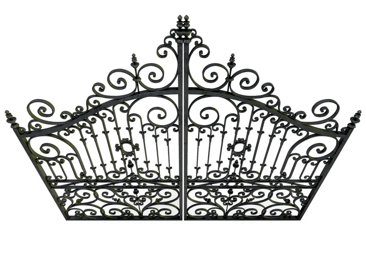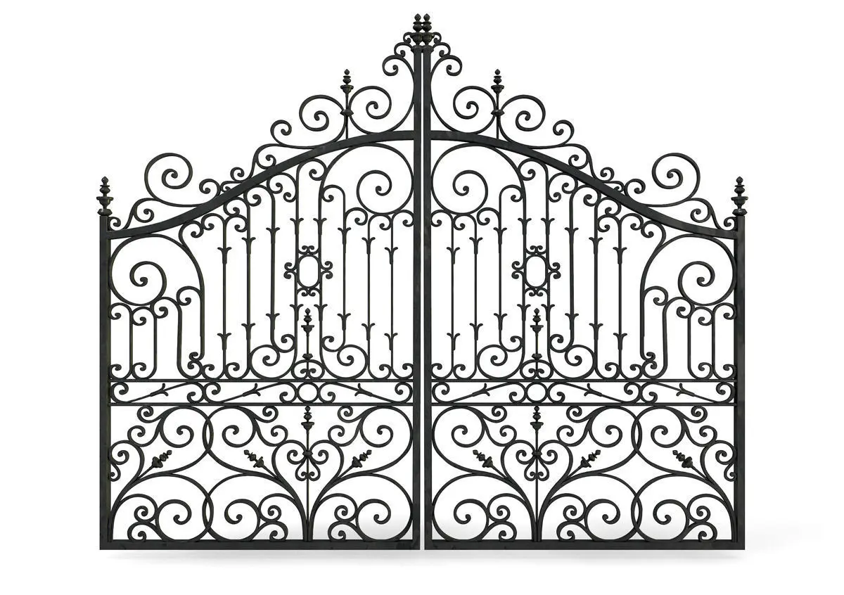 A set of swinging ornate cast iron metal gates.