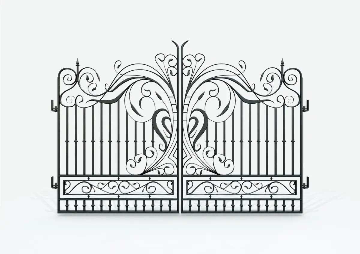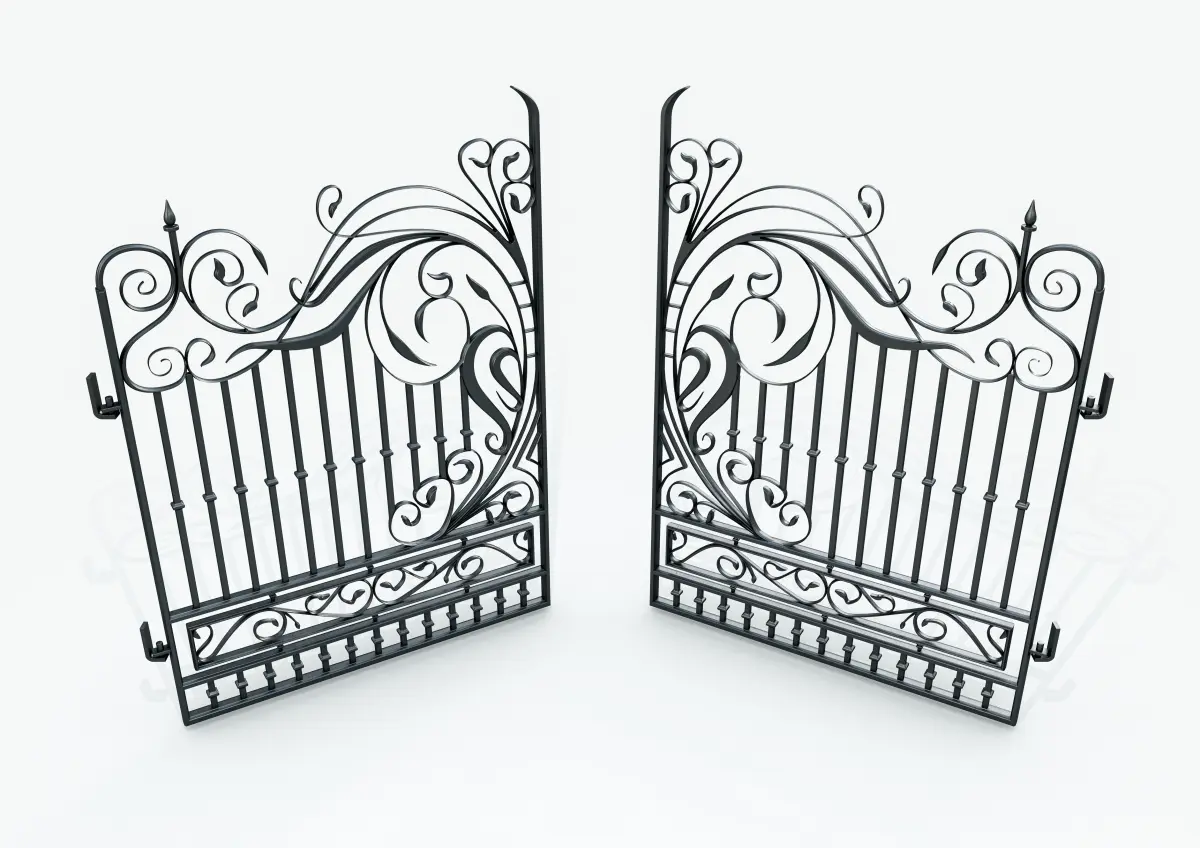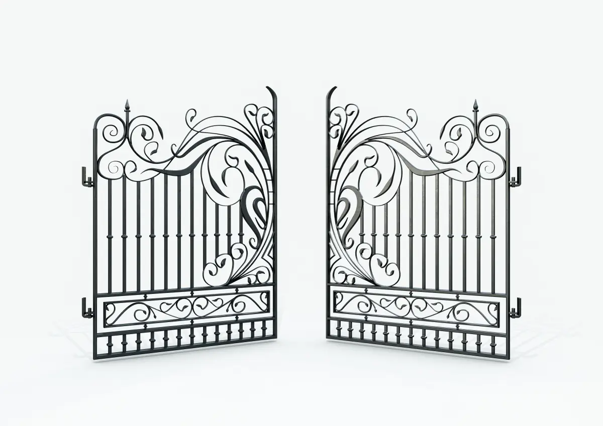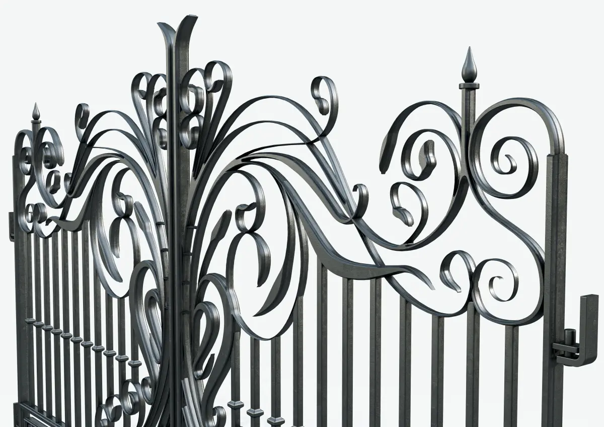 An intricate and decorative driveway entrance gate made of cast iron . Contains procedural and parametrized meshes which may translate to higher poly count than stipulated if converted to other formats.