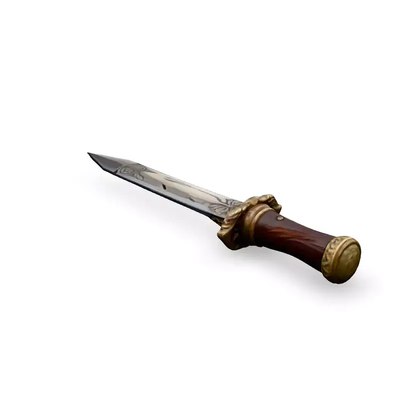 This 3D model depicts a highly detailed, ornate fantasy dagger, perfect for game development, film, or other creative projects. The dagger features intricate engravings on both the blade and the hilt, lending a touch of elegance and ancient craftsmanship to its design. The hilt is crafted with a rich, dark wood texture contrasted by gold accents, providing a comfortable and secure grip. This model is suitable for both real-time applications such as games and AR/VR experiences, and high-quality static renders for cinematics or pre-rendered sequences. Available formats include GLB, OBJ, STL, FBX, and DAE. It is optimized for real-time use with a balanced polygon count and clean topology. The UVs are unwrapped and non-overlapping, ready for texturing with your own custom PBR materials or for use with the included PBR textures. The dagger is ideal for equipping fantasy characters, adding to a scene's props, or close-up hero shots showcasing the craftsmanship. Its detailed design brings a unique, high-quality asset to any project.