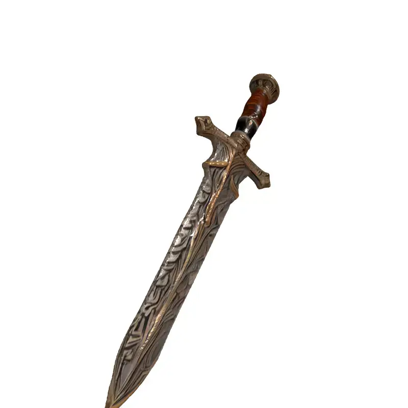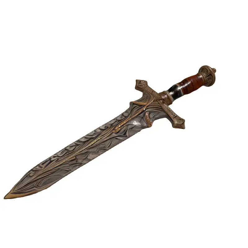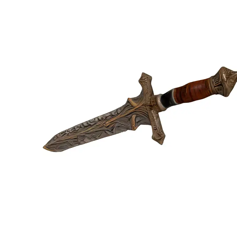 This meticulously crafted 3D model depicts an ornate fantasy sword, ideal for game development, particularly RPGs and fantasy adventures. It's also suitable for cinematic renders, digital art, and potentially 3D printing with appropriate modifications. The model features a beautifully detailed blade with intricate engravings and a two-toned finish, complemented by an equally ornate hilt with a wooden grip and decorative pommel. Available in multiple formats (GLB, OBJ, FBX, STL), this asset is optimized for both real-time and static rendering. It boasts clean topology, UV unwrapped, and PBR textures, ensuring seamless integration into various projects. The sword is game-ready, with an optimized polycount for performance while retaining high visual fidelity. Its unique design makes it a perfect hero prop or collectible item within a game world. The level of detail also allows for close-up shots and renders. This model is ready to enhance your project with its striking aesthetics and versatile applications.