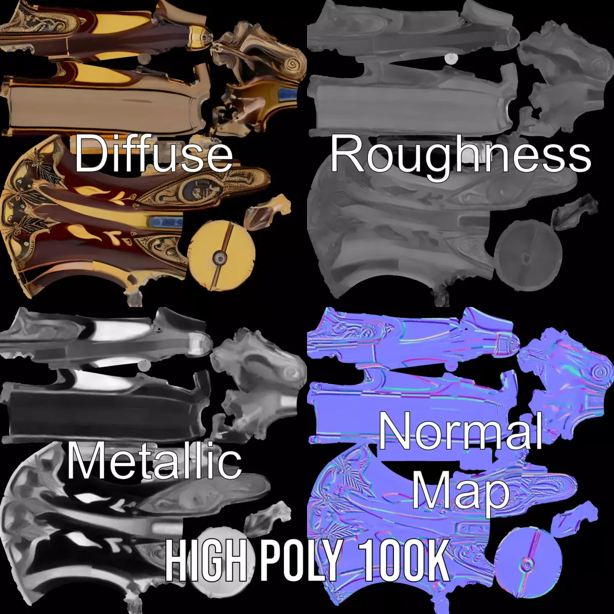 This Ornate Flintlock Pistol model pack features a beautifully detailed historical firearm with intricate engravings and a polished wooden handle, perfect for period-themed projects and displays. Each model has 3 levels of detail: low-poly (1000 triangles for mobile), middle-poly (10,000 triangles for environment), and high-poly (100,000 triangles), which allows for the use of this model in production rendering (such as 3ds Max, Maya, Cinema 4D, Blender, Vray/Corona/Cycles and all other), game engines (Unity and Unreal compatible), and interactive presentations, providing a choice of detail based on the LOD System principle. Ideal for use in games, films, and virtual museum exhibits. The model's textures are PBR, Diffuse, NormalMap, and reflection/roughness/metallic, which are suitable for any modern rendering engine. All models accurately unwrapped and have no overlapping UVs. All textures are 4096x4096 in size. Please like and leave a comment if you enjoyed this model.