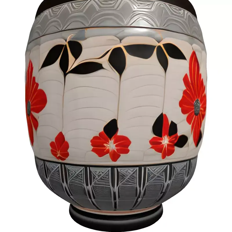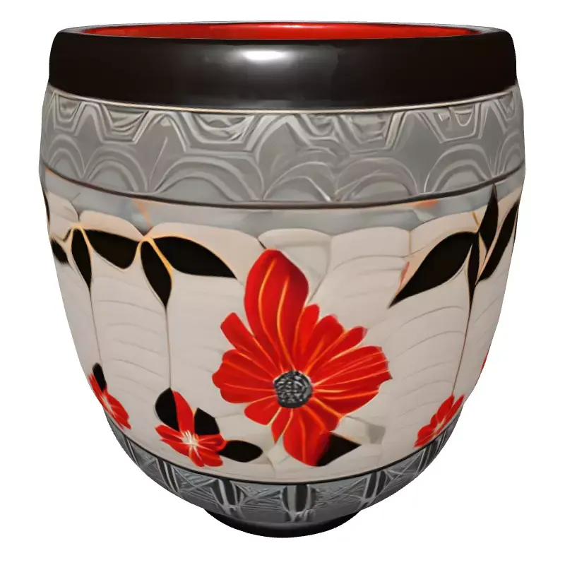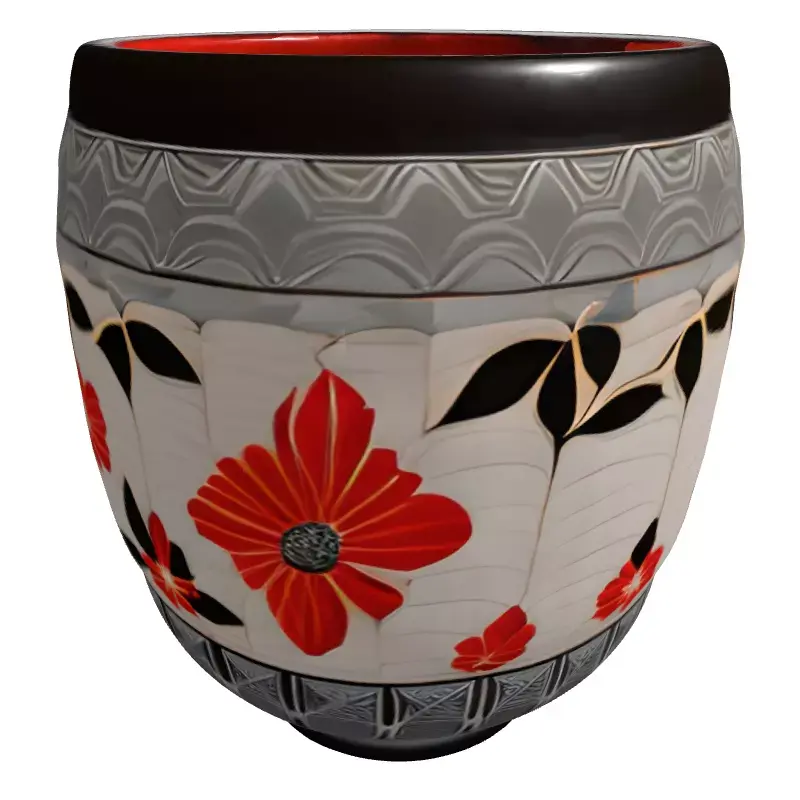 This exquisite 3D model presents a highly detailed decorative pot, inspired by elegant Asian artistic traditions. It features a sophisticated design with vibrant red floral motifs, accentuated by deep black leaves, intricately set against a subtly textured, off-white background. The top and bottom bands are adorned with a unique, repeating geometric wave pattern in a muted grey, complementing the central floral theme. The interior boasts a rich, dark reddish-brown hue, adding to its luxurious aesthetic. This versatile model is perfect for enhancing interior architectural visualizations, creating realistic game environment props, enriching AR/VR scenes, or serving as a focal point in digital art renders. Its high level of detail and clean, optimized topology make it suitable for close-up shots and high-resolution rendering, ensuring a visually stunning result. While ideal for static renderings and cinematics, it can also be adapted for real-time applications with appropriate poly-reduction and LODs. The model is fully UV unwrapped and designed with PBR texture workflow in mind, ensuring accurate material representation across various rendering engines. It is provided in multiple industry-standard formats, including GLB, OBJ, FBX, USD, and PLY, ensuring broad compatibility with most 3D software. Additional formats like STL, DAE, and ABC may also be included for diverse project needs. Elevate your scenes with this stunning piece of digital craftsmanship.
