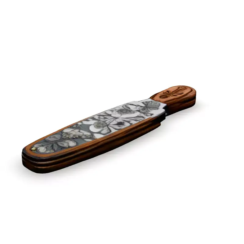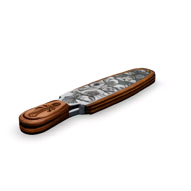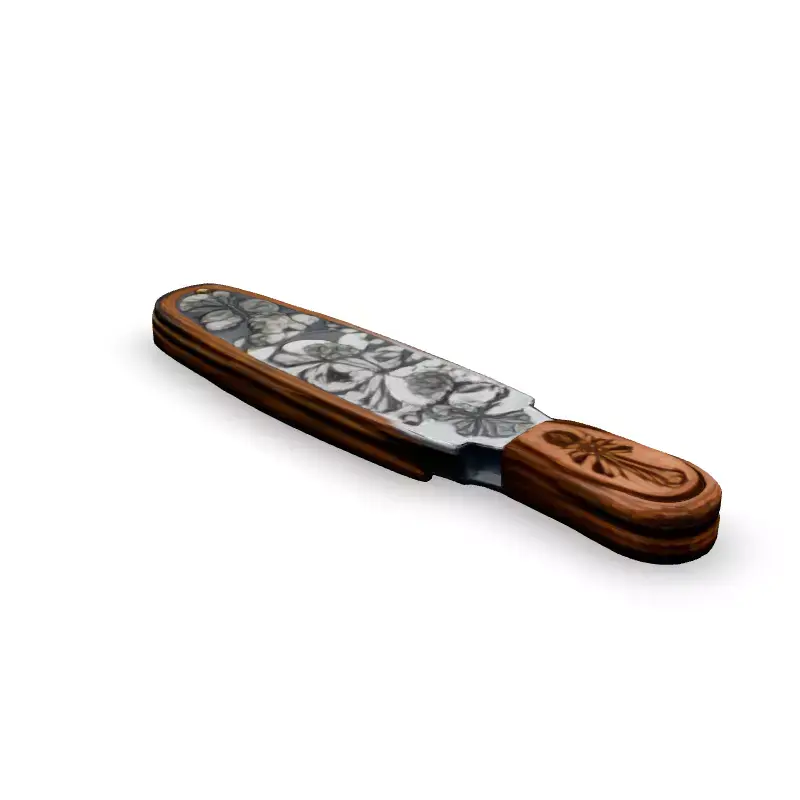 This highly detailed 3D model features an ornate knife with intricate floral engravings on the blade and a beautifully carved wooden handle. Ideal for game development, especially RPGs or adventure titles, as well as for close-up renders, digital art, and potentially as a reference for 3D printing or CNC milling. Available formats include GLB, OBJ, STL, FBX, and DAE. Optimized for both real-time applications and high-quality static renders. This model boasts clean topology, UV unwrapped meshes, and PBR textures for realistic material representation. The floral engravings add a touch of elegance and craftsmanship, making it a unique asset for various projects. Whether used as a prop in a virtual environment or as a centerpiece in a digital artwork, this knife model is sure to impress. The high-resolution textures capture the intricate details of the wood grain and the metallic sheen of the blade. It is suitable for both close-up shots and integration into larger scenes. Its versatile design allows for use in a variety of contexts, from fantasy settings to historical recreations.