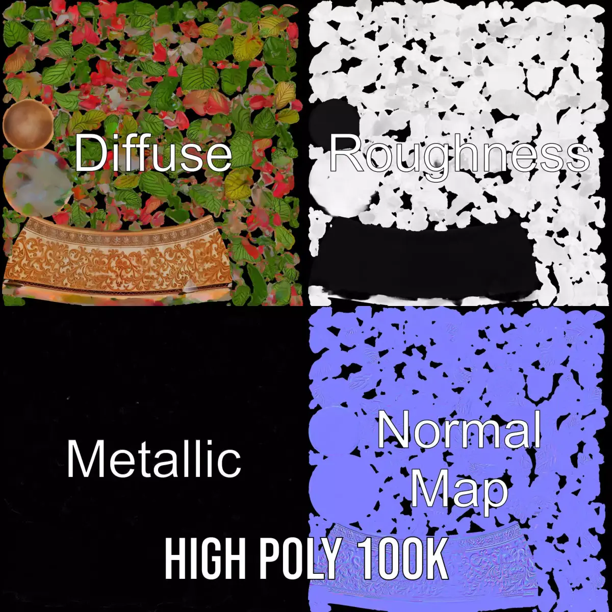 The Ornate Floral Vase model pack features a beautifully detailed vase with intricately designed patterns and lush, vibrant foliage, perfect for adding a touch of elegance to any scene. This model is ideal for interior decor visualizations, game environments, and cinematic scenes. Each model has 3 levels of detail: low-poly (1000 triangles for mobile), middle-poly (10,000 triangles for environment), and high-poly (100,000 triangles), which allows for the use of this model in production rendering (such as 3ds max, Maya, Cinema4d, Blender, Vray/Corona/Cycles and all other), game engines (Unity and Unreal compatible), and interactive presentations, providing a choice of detail based on the LOD System principle. The model's textures are PBR, Diffuse, NormalMap, and reflection/roughness/metallic, which are suitable for any modern rendering engine. All models are accurately unwrapped and have no overlapping UV. All textures are 4096*4096 in size. Please like and leave a comment for the model if you enjoyed it.
