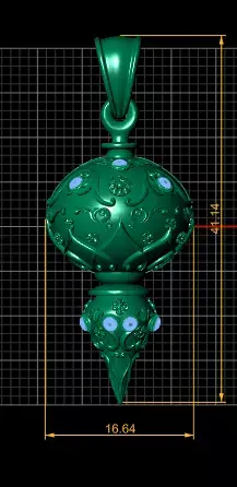 An ornate gold pendant with a spherical body and pointed base, adorned with intricate floral scrollwork and studded with sparkling gemstones. Its regal design and fine detailing give it the look of a royal scepter or ceremonial ornament.