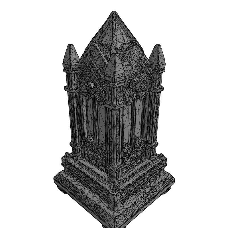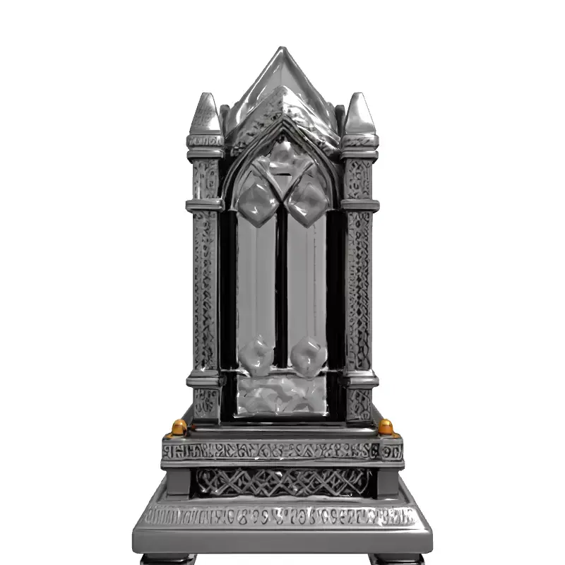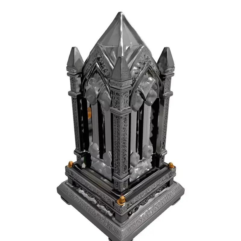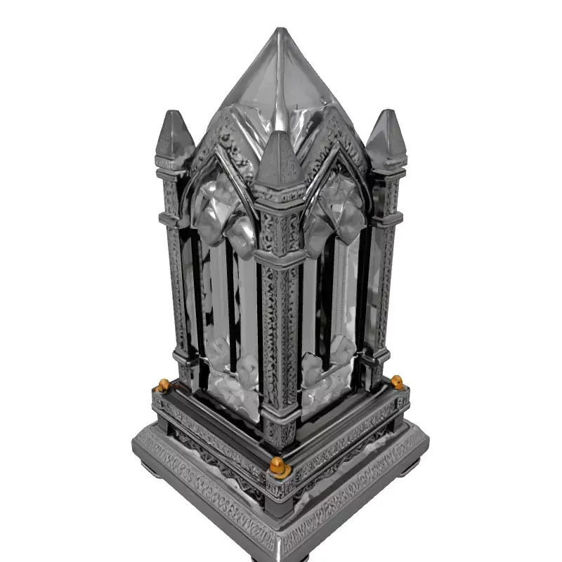 Presenting a meticulously crafted 3D model of an ornate Gothic crystal object, exuding luxury and historical grandeur. This highly detailed asset features a sophisticated metallic framework adorned with numerous precisely cut gemstones, mimicking the intricate designs found in ancient reliquaries or ceremonial lanterns. The model's design incorporates classic Gothic architectural elements such as pointed arches, spires, and elaborate tracery, giving it a distinctive and elegant silhouette.