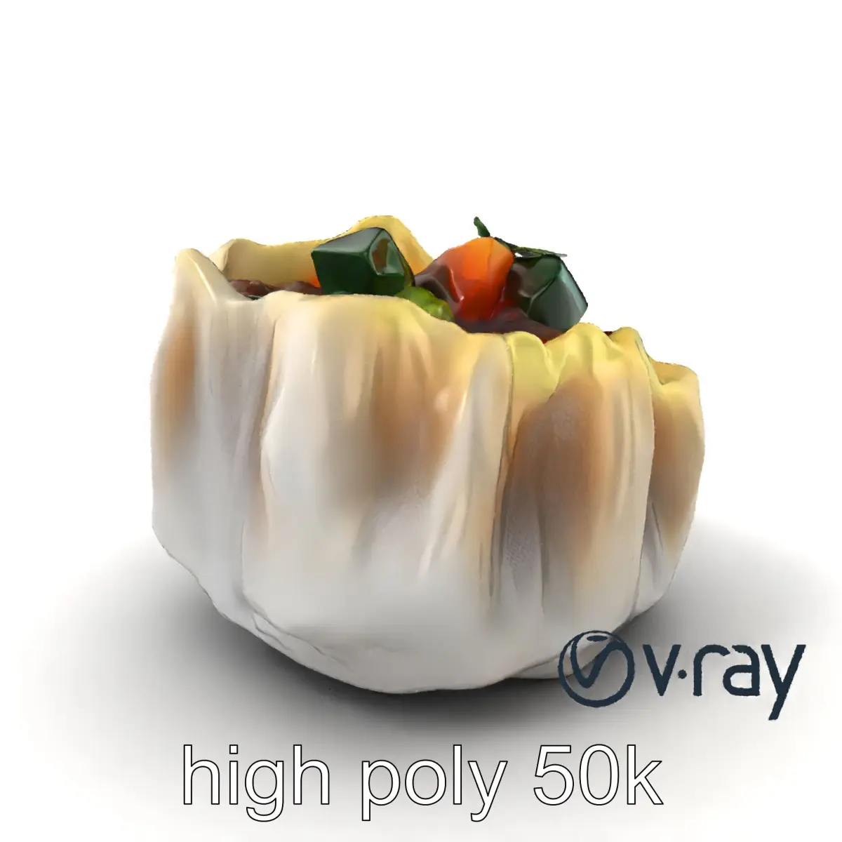 This ornate gyoza dumpling model is perfect for culinary visualizations, food-themed games, and interactive cooking presentations. Featuring a vibrant veggie medley filling with a realistic, chewy skin texture, it's designed to add a touch of authenticity and artistry to your projects.