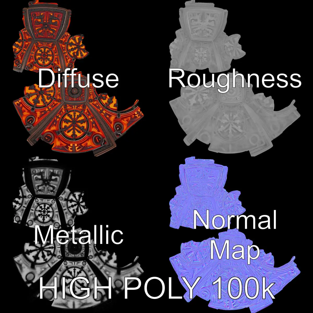 The model includes low-poly (1,000 triangles) for mobile, middle-poly (10,000 triangles) for environments, and high-poly (100,000 triangles) for detailed renders. Textures are PBR with 4096*4096 resolution, including Diffuse, NormalMap, and reflection/roughness/metallic, ensuring compatibility with modern rendering engines like Blender, Unity, and Unreal. The model features non-overlapping UVs for precise texturing.