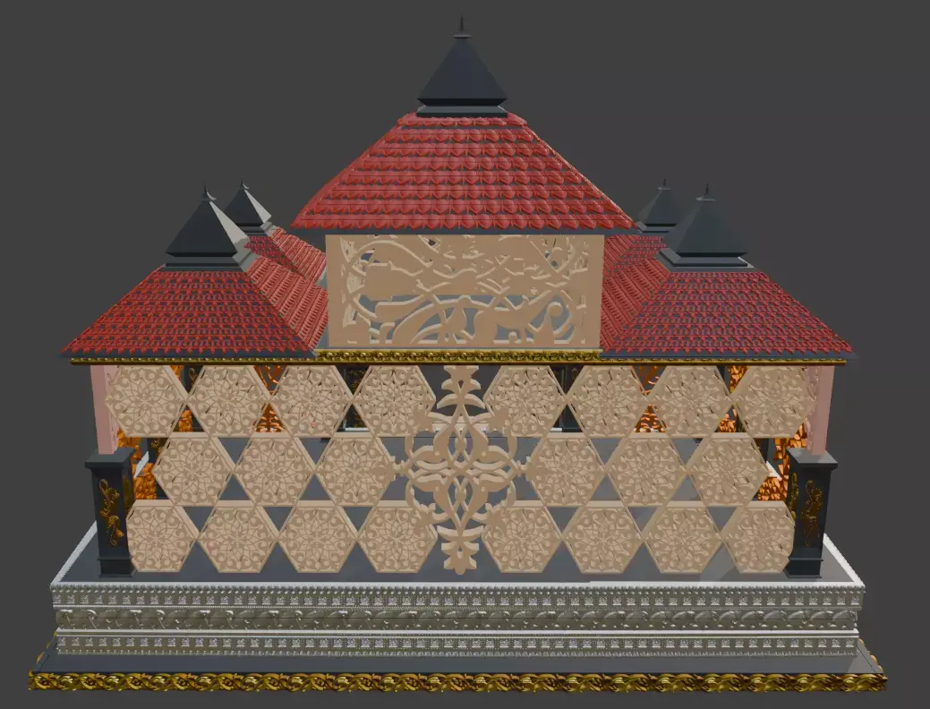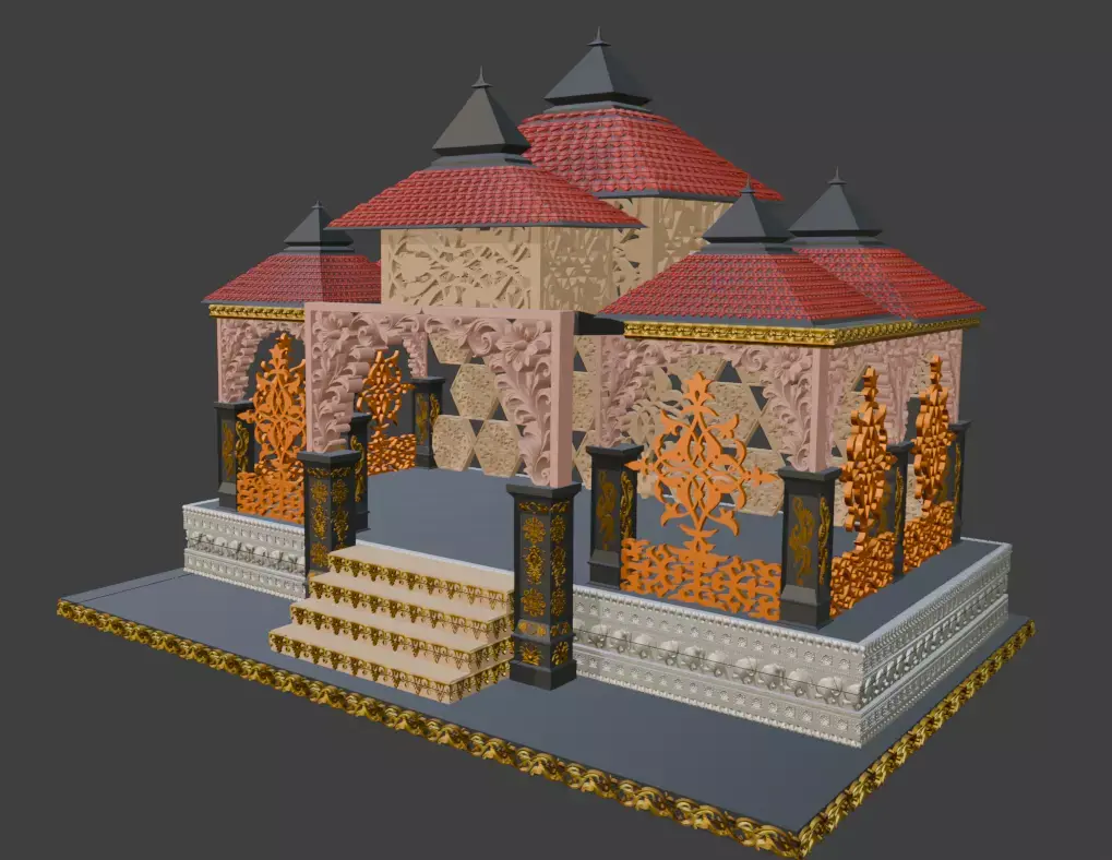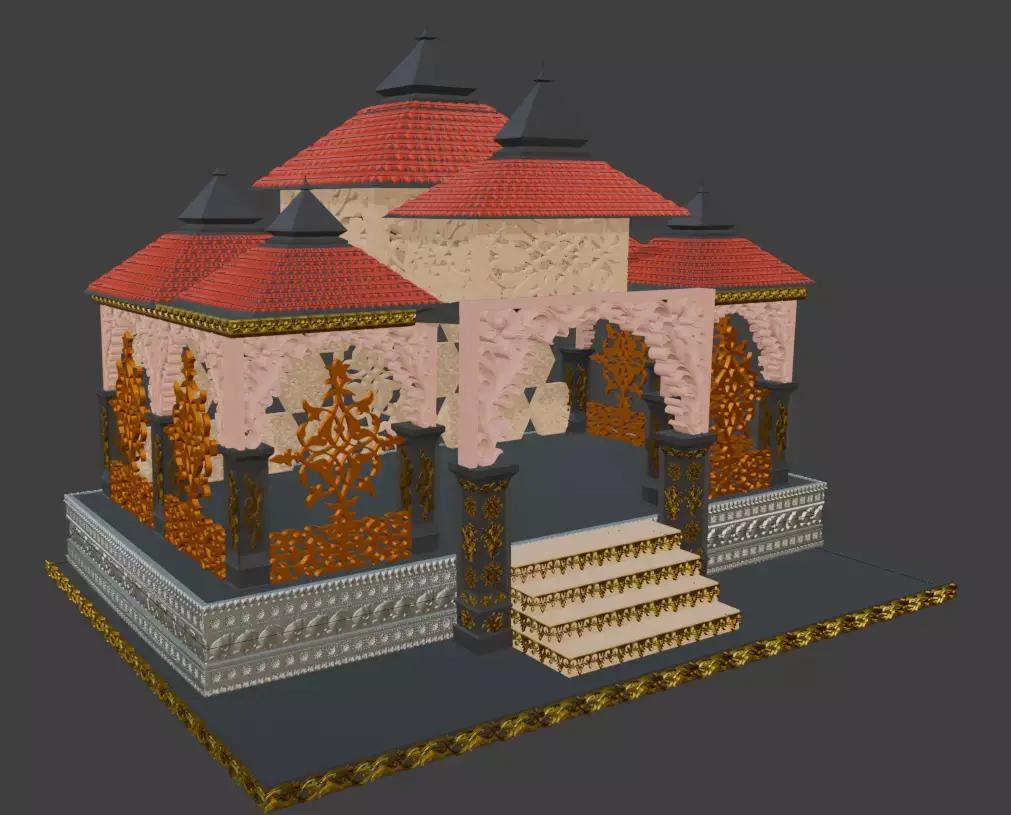 This highly detailed ornamental Indian temple pavilion (mandap) 3D model is designed for 3D printing, decoration, diorama, miniature architecture, and religious display projects. The model features intricate jaali patterns, layered temple roofs, carved pillars, decorative panels, and stepped platform details inspired by traditional Indian architecture.