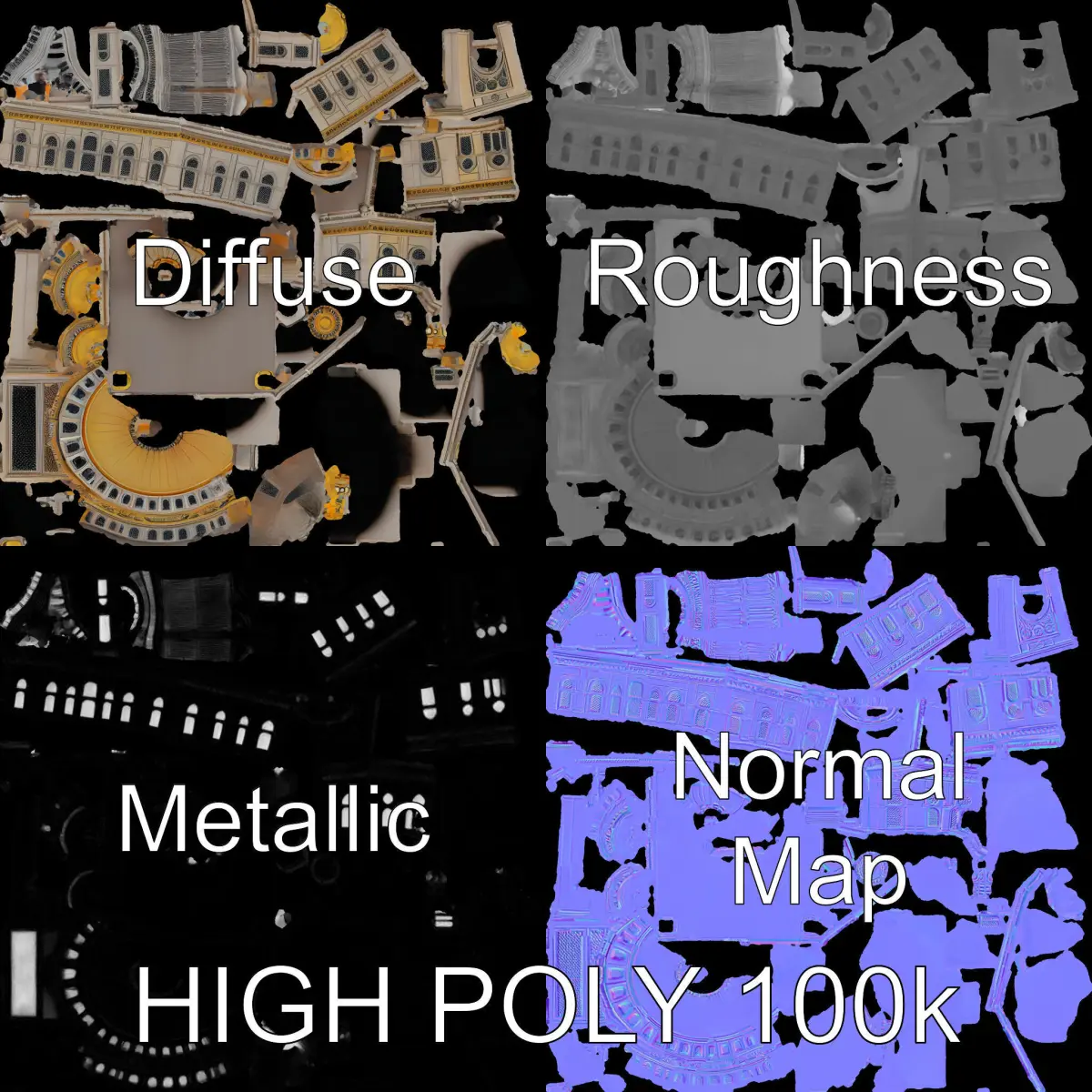 This mosque architecture model pack offers three distinct levels of detail: low-poly for mobile applications (1,000 triangles), middle-poly for environmental settings (10,000 triangles), and high-poly for production rendering (100,000 triangles). Perfect for any modern rendering engine, these models feature PBR, Diffuse, NormalMap, and reflection/roughness/metallic textures in 4096x4096 resolution. All models are accurately unwrapped with no overlapping UVs, offering seamless integration into game engines like Unity and Unreal, as well as in 3D software such as 3ds Max, Maya, and Blender.