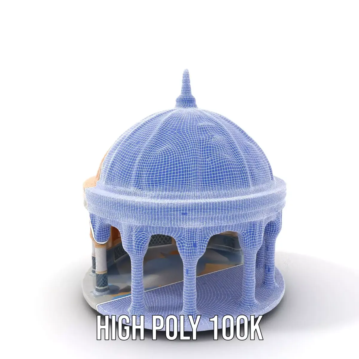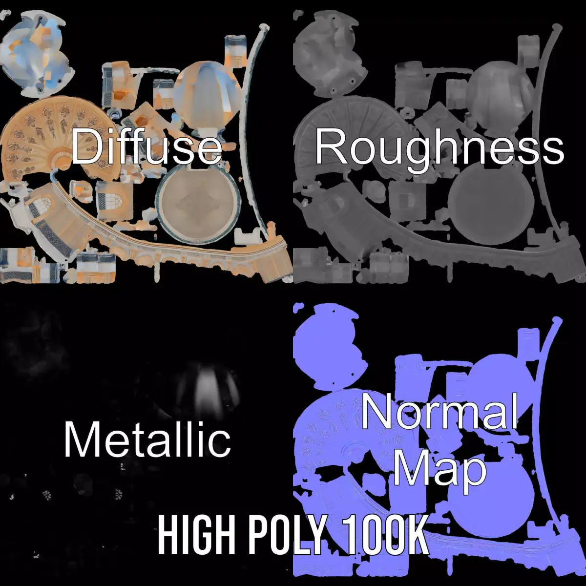 This Ornate Pavilion Dome model pack features an intricately designed structure ideal for architectural visualizations, historical reconstructions, and artistic renderings. Each model has 3 levels of detail: low-poly (1000 triangles for mobile), middle-poly (10,000 triangles for environment), and high-poly (100,000 triangles), allowing for use in production rendering (such as 3ds Max, Maya, Cinema4D, Blender, Vray/Corona/Cycles and more), game engines (Unity and Unreal compatible), and interactive presentations. This model's textures include PBR, Diffuse, NormalMap, and reflection/roughness/metallic, suitable for modern rendering engines. All models are accurately unwrapped with no overlapping UVs, and textures are 4096x4096 in size. If you like this model, please leave a like and comment!