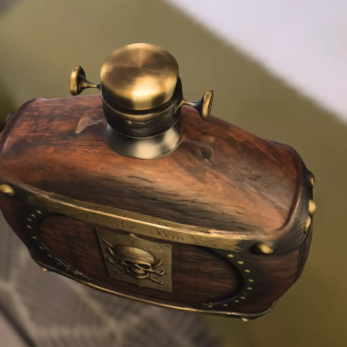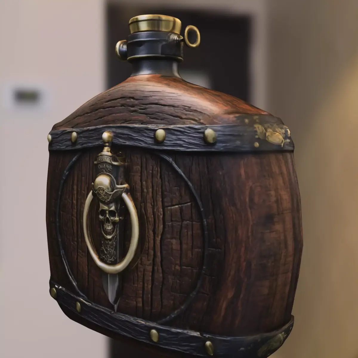 This detailed 3D model showcases an ornate pirate-style flask made of aged wood and reinforced with metal bands, featuring a striking skull-and-dagger emblem with a decorative ring. Ideal for integration into popular game engines such as Unity, Unreal Engine, and Godot, it can enhance titles like Sea of Thieves, Assassin’s Creed IV: Black Flag, The Witcher 3, Skyrim, and Dark Souls as a collectible prop, quest item, or environmental detail.