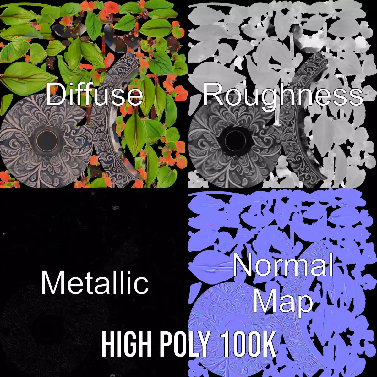 This 3D model pack features an ornate plant pot with lush, vibrant greenery and orange flowers, perfect for filling virtual environments with a touch of nature and elegance. Each model has 3 levels of detail: low-poly (1000 triangles for mobile), middle-poly (10,000 triangles for environment), and high-poly (100,000 triangles), which allows for the use of this model in production rendering (such as 3ds max, Maya, Cinema4d, Blender, Vray/Corona/Cycles and all other), game engines (Unity and Unreal compatible), and interactive presentations, providing a choice of detail based on the LOD System principle.Ideal for virtual garden scenes, interior design visualizations, or as a decoration in gaming environments. The model's textures are PBR, Diffuse, NormalMap, and reflection/roughness/metallic, suitable for any modern rendering engine. All models are accurately unwrapped with no overlapping UVs. All textures are 4096*4096 in size. If you enjoyed this model, please like and leave a comment!