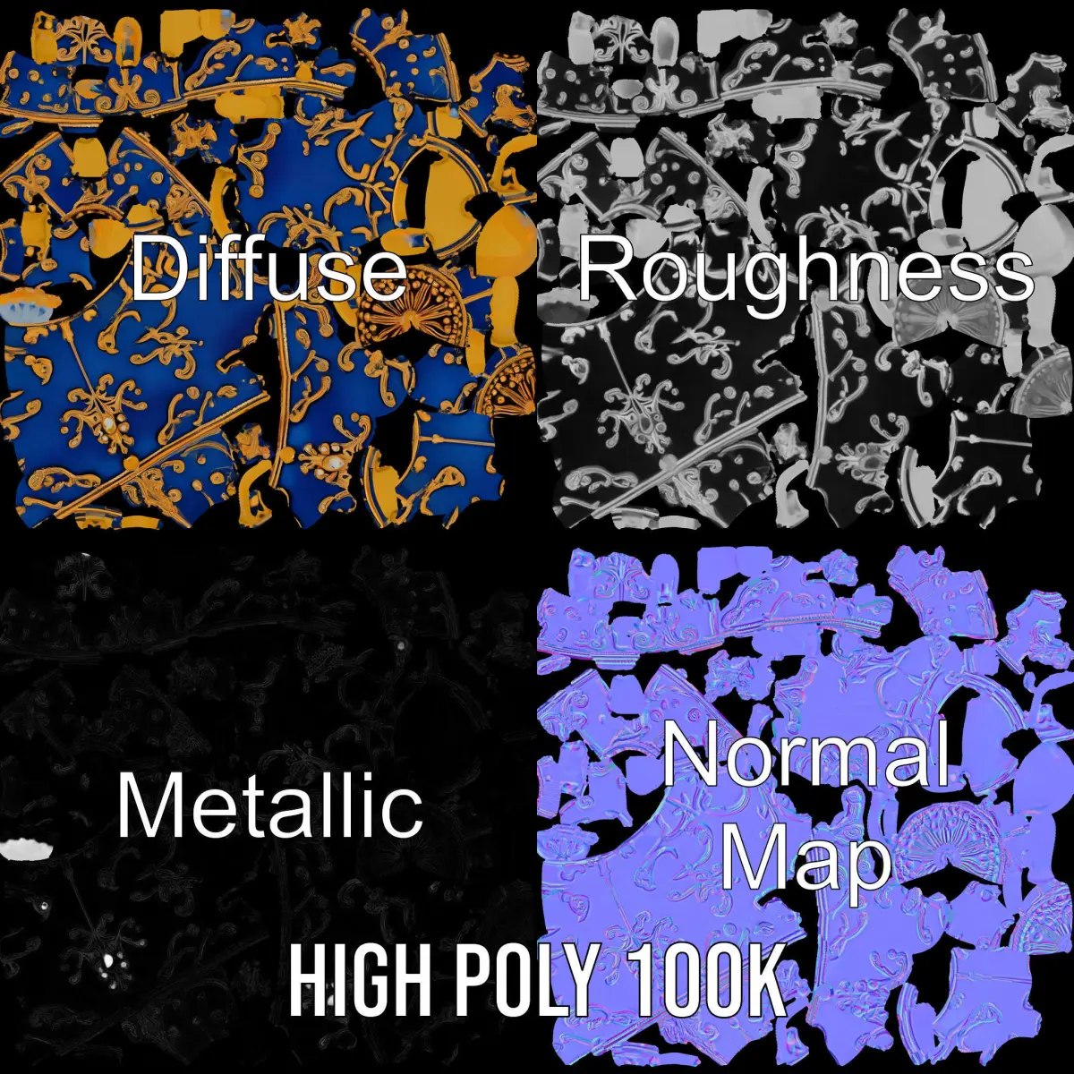 This Ornate Royal Blue Egg with Gold Accents Model Pack features a detailed 3D model of an exquisite decorative egg, perfect for art projects, games, and simulations. Each model offers three levels of detail: low-poly for mobile, middle-poly for environments, and high-poly for production rendering. The egg is adorned with intricate gold patterns and stands on elegant legs, rendering it suitable for historical and luxury-themed scenes. With 4096*4096 PBR textures including Diffuse, NormalMap, and reflection/roughness/metallic maps, the model is ideal for modern rendering engines. Models are accurately unwrapped with no overlapping UVs.