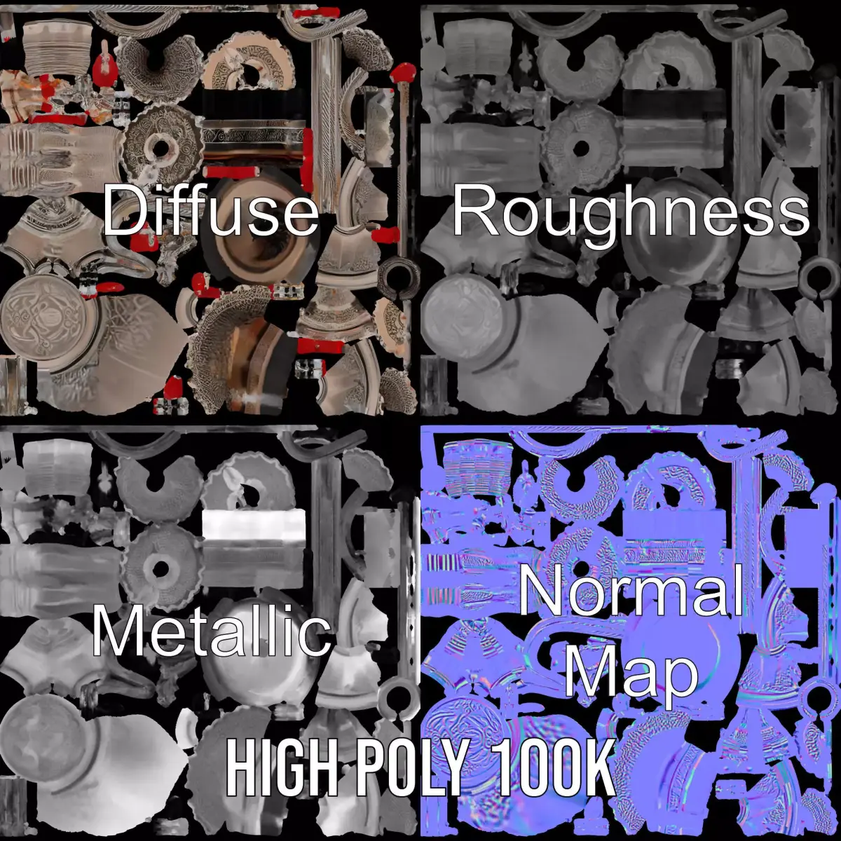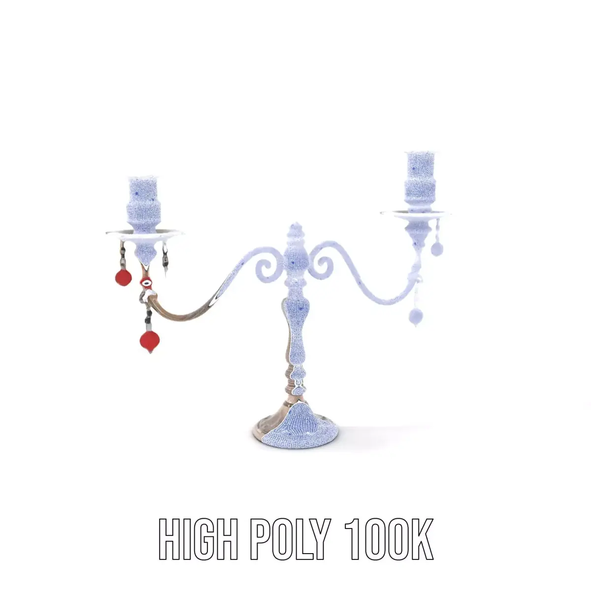 The Ornate Silver Candelabra model pack features a beautifully detailed two-arm candelabra, designed in an intricate vintage style and adorned with red decorative elements. Its elegant curves and detailed patterns make it ideal for use in historical scenes, antique collections, or luxurious interior designs. Each model includes three levels of detail: low-poly (1000 triangles for mobile), middle-poly (10,000 triangles for environment), and high-poly (100,000 triangles), allowing for versatile use in production rendering (such as 3ds Max, Maya, Cinema4D, Blender, V-Ray/Corona/Cycles, and all others), game engines (Unity and Unreal compatible), and interactive presentations. The model's textures are PBR, including Diffuse, Normal Map, and reflection/roughness/metallic, suitable for any modern rendering engine. All models are accurately unwrapped with no overlapping UVs. Textures are 4096*4096 in size. If you like this model, please give it a thumbs up and leave a comment!