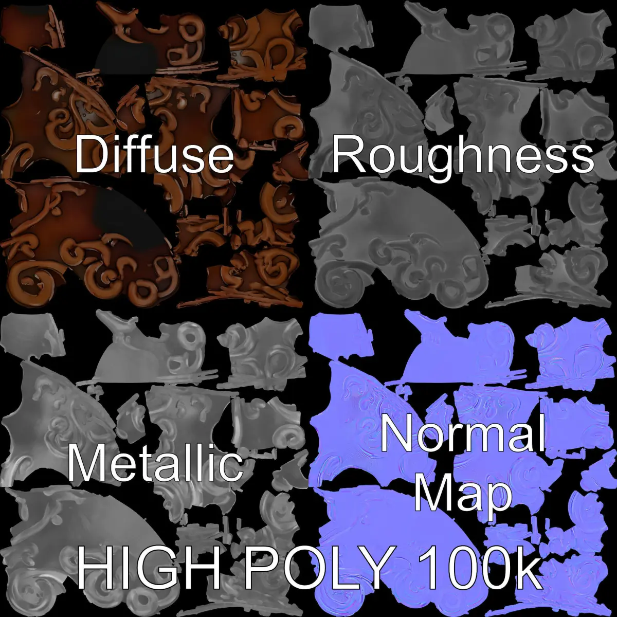 This ornate sphere model pack features three levels of detail: low-poly for mobile applications, mid-poly for environment integrations, and high-poly for production rendering. The decorative swirls add an elegant touch, making it suitable for use in virtual interiors, art installations, or as part of architectural visualizations. The model utilizes PBR textures, including Diffuse, NormalMap, and reflection/roughness/metallic, all at 4096x4096 resolution, compatible with modern rendering engines and game engines like Unity and Unreal. Models are unwrapped accurately with no overlapping UVs.