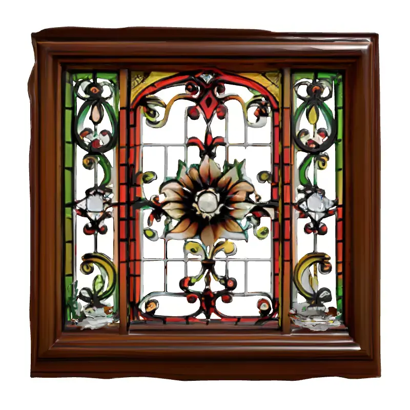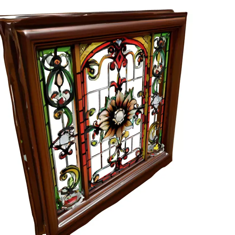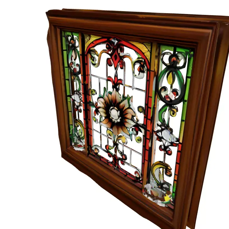 This highly detailed 3D model presents an exquisite stained glass window encased within a robust, dark wood frame, perfect for enriching a variety of digital environments. The central stained glass panel features a captivating floral motif with a prominent bloom, surrounded by intricate scrollwork and symmetrical patterns rendered in vibrant hues of red, green, yellow, and orange. The design evokes a timeless, classic aesthetic, making it ideal for historical, gothic, or traditional architectural visualizations. Possible applications include enhancing interior or exterior scenes of churches, cathedrals, grand homes, or fantasy settings in game development. It is also suitable for high-quality static renderings, animated sequences, or immersive AR/VR experiences where visual fidelity is paramount. The model is typically provided with clean topology and is fully UV unwrapped to ensure seamless texture application. It features physically based rendering (PBR) textures for realistic material representation of both the rich wood grain and the luminous, translucent stained glass. Supported file formats often include GLB, OBJ, FBX, DAE, USD, STL, ABC, and PLY for versatility across different 3D software and engines. The model's intricate details make it particularly well-suited for close-up shots and high-resolution renders, adding a touch of elegance and realism to any project.