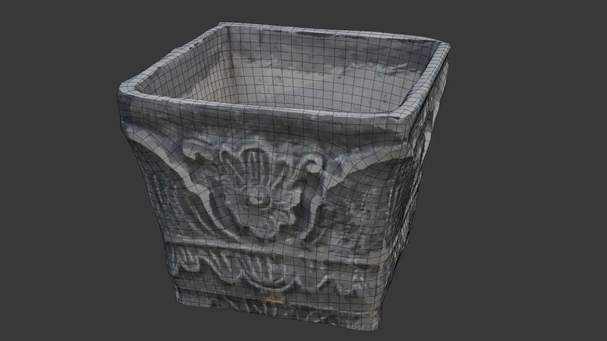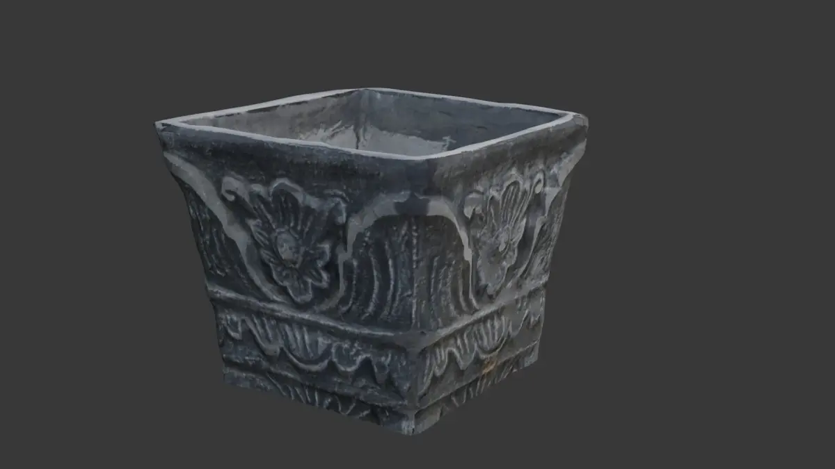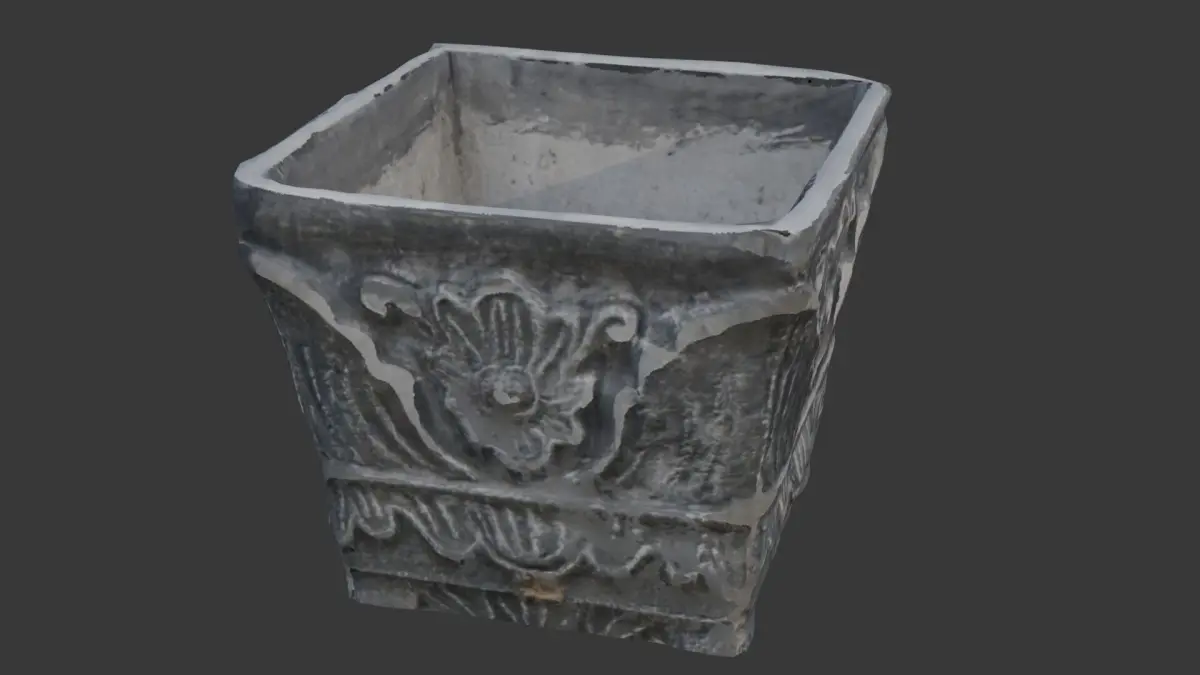 A high-quality 3D scan of an ornate stone planter featuring intricate floral carvings and aged weathering. This realistic asset is ideal for architectural visualization, garden design, historical reconstruction, and game environments. The detailed 4K PBR textures capture the stone material's natural wear and surface imperfections for ultra-realistic rendering.
