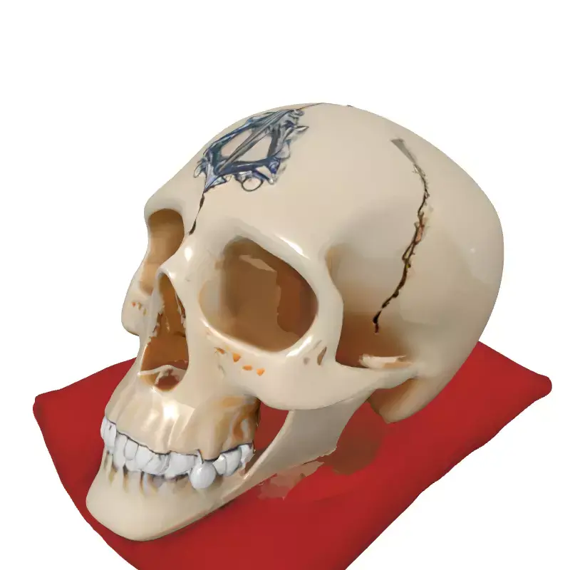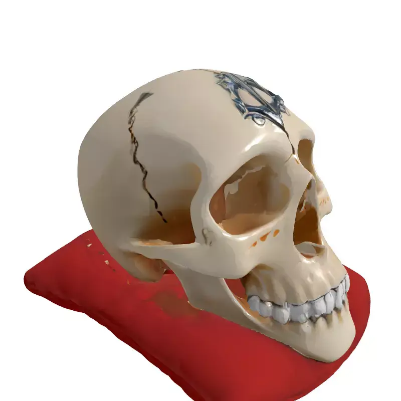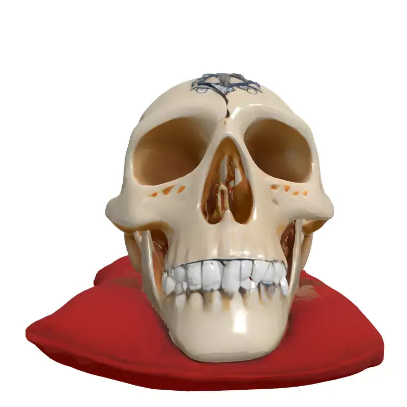 Presenting a meticulously crafted 3D model of a stylized human skull, distinguished by its unique artistic embellishments. This exquisite model features finely detailed sutures etched across the cranium and an ornate metallic emblem elegantly placed on the forehead, adding a touch of mystique and sophistication. The skull is dramatically presented resting upon a plush, deep red velvet pillow, enhancing its luxurious and decorative appeal. The teeth are rendered with a striking metallic finish, contributing to the model's distinctive character. This versatile asset is ideal for a wide range of creative projects, including enhancing game environments (particularly for fantasy, gothic, or dark academia themes), enriching architectural visualization scenes as a unique decorative prop, and integrating into augmented reality (AR) or virtual reality (VR) experiences. Its high level of detail also makes it perfect for digital art, cinematic renders, and even as a centerpiece for a digital collection. The model boasts clean topology, making it suitable for both real-time applications (with potential for LODs) and high-resolution static renderings. It comes fully UV unwrapped and includes high-quality PBR textures for realistic material representation. Supported file formats typically include GLB, OBJ, STL, ABC, DAE, FBX, USD, and PLY, ensuring broad compatibility across various 3D software and engines. This asset is ready to be dropped into your scene and elevate your project with its artistic flair and detailed craftsmanship.