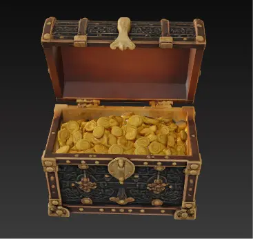 This highly detailed 3D model of an ornate treasure chest is perfect for use in games, animations, and 3D visualizations. The chest features an elegant gold and red design, intricate engravings, and a realistic treasure-filled interior.