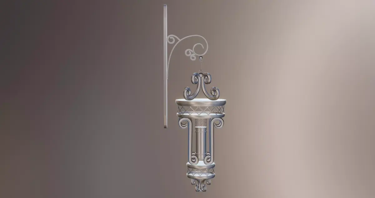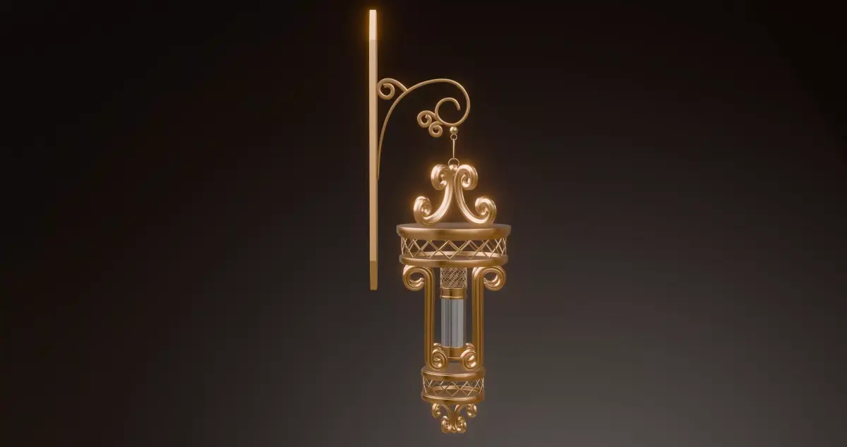 This is a high-quality 3D model of an Ornate Vintage Wall Lantern, designed with elegant metal scrollwork and a stylized antique aesthetic. The lantern features intricate decorative patterns, a hanging structure, and a classic cylindrical lamp body, making it suitable for a wide range of 3D projects.