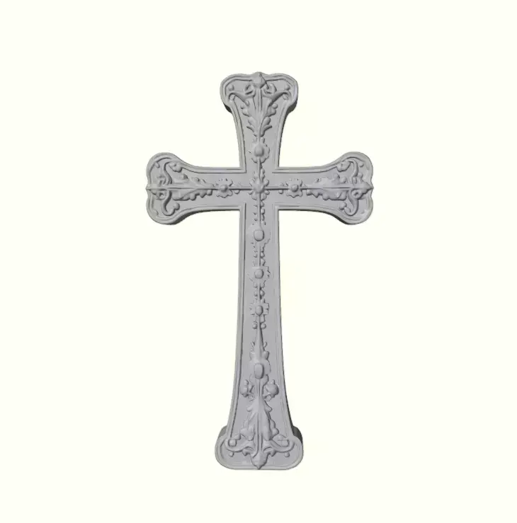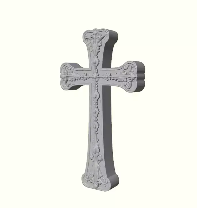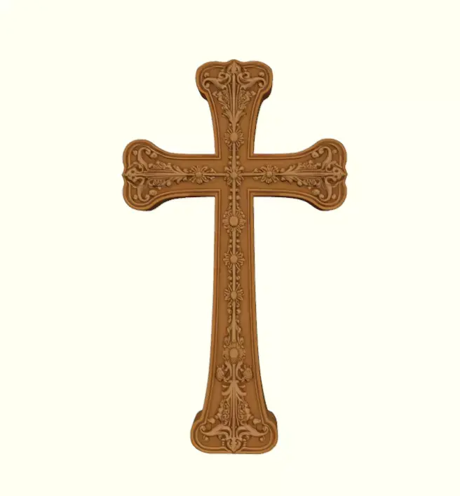 The front face carries symmetrical floral and scroll ornamentation running along the vertical and horizontal arms, framed by a raised border that helps the relief stand out after printing. The silhouette has gently widened arm ends and softened transitions, giving it a plaque-like presence. The back is flat and smooth, which suits wall mounting, panel décor, or gluing onto a base or stand. The thickness is consistent enough for practical 3D printing, and the details remain readable for painting, drybrushing, or wood-stain style finishes.