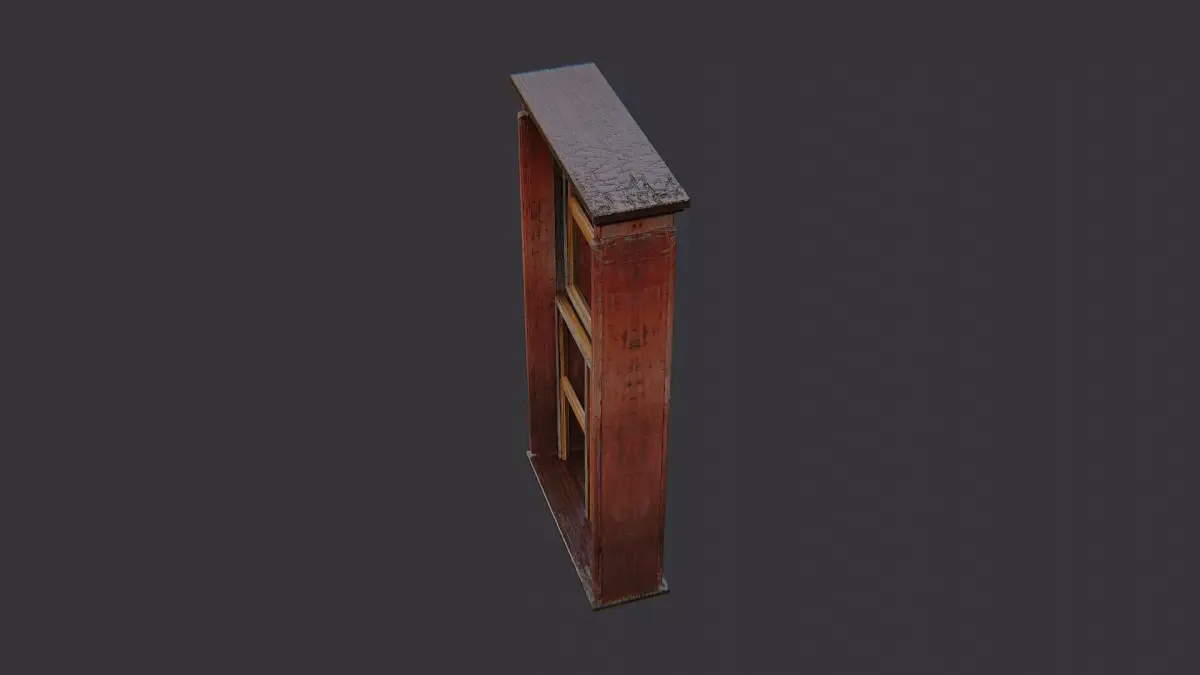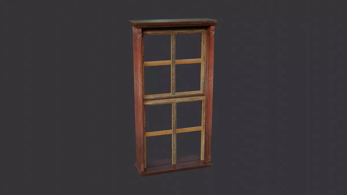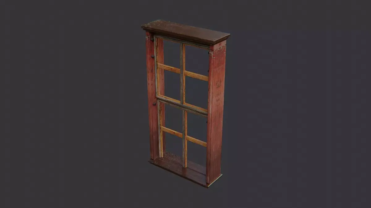 A handcrafted ornate wooden window frame with a weathered finish. This model features two textures: a rich wood base and a rusted metal hinge accent. Ideal for rustic interiors, vintage storefronts, or architectural visualizations. Use in exterior walls, interior scenes, or historical reconstructions.