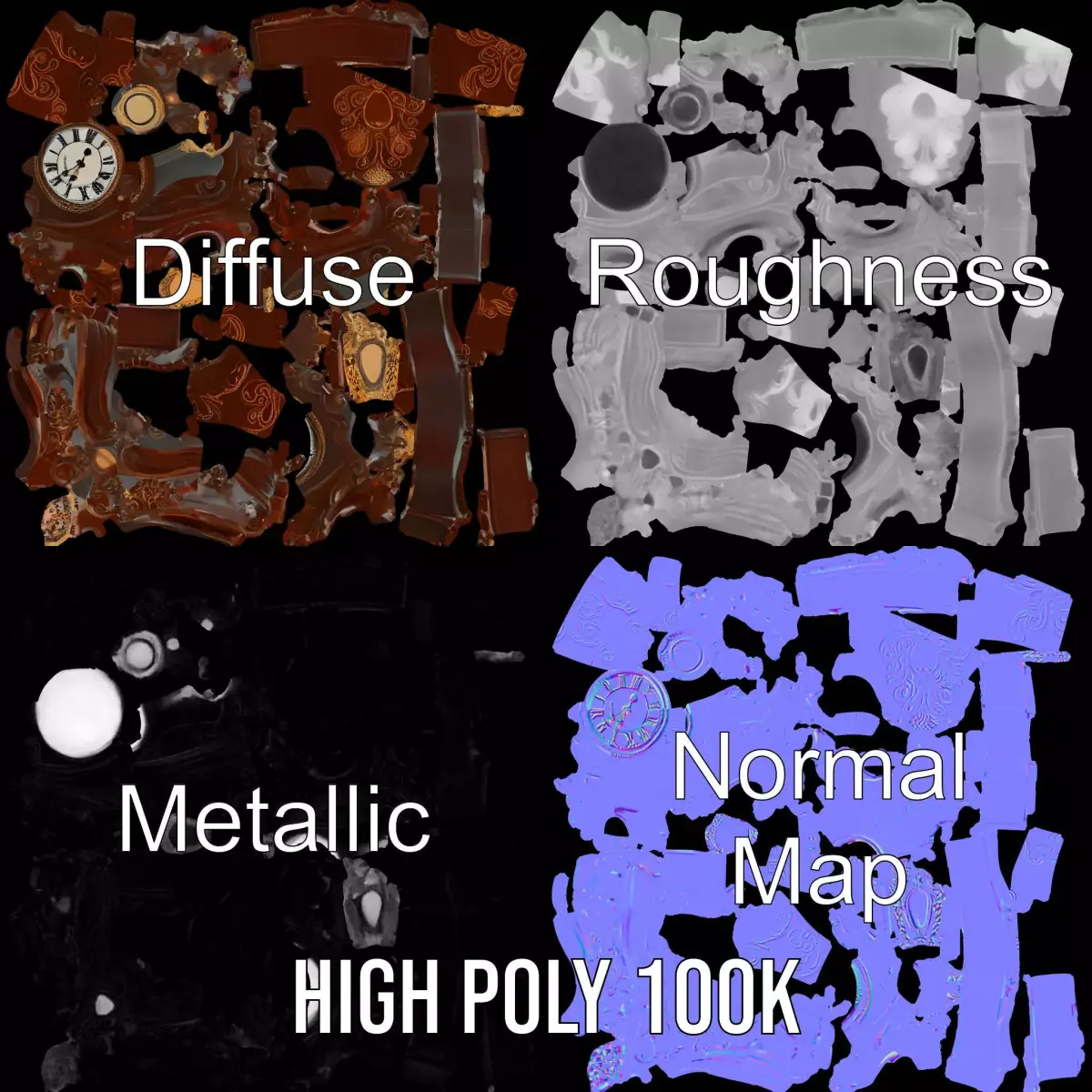 This exquisite model pack features an ornate wooden clock with intricate carvings. The design blends elegance and functionality, making it ideal for historical and vintage-themed scenes. Each model has 3 levels of detail: low-poly (1000 triangles for mobile), middle-poly (10,000 triangles for environment), and high-poly (100,000 triangles), which allows for use in production rendering (such as 3ds Max, Maya, Cinema4D, Blender, Vray/Corona/Cycles, and all others), game engines (Unity and Unreal compatible), and interactive presentations, providing a choice of detail based on the LOD System principle. Perfectly suited for interior design visualizations, period dramas, and architectural projects, offering a timeless aesthetic appeal. The model's textures are PBR, Diffuse, NormalMap, and reflection/roughness/metallic, which are suitable for any modern rendering engine. All models are accurately unwrapped and have no overlapping UVs. All textures are 4096*4096 in size. If you like this model, please leave a comment and like it.