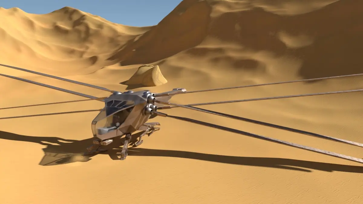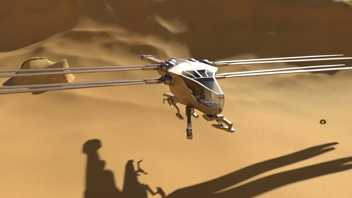 It's ornithopter from 'Dune' movie.Because the leg and wing parts are separated, motion can be created.In order to make the aircraft from the movie as similar as possible, I started modeling based on various photos and data.There is no desert background. I found desert background in Cgtrader.