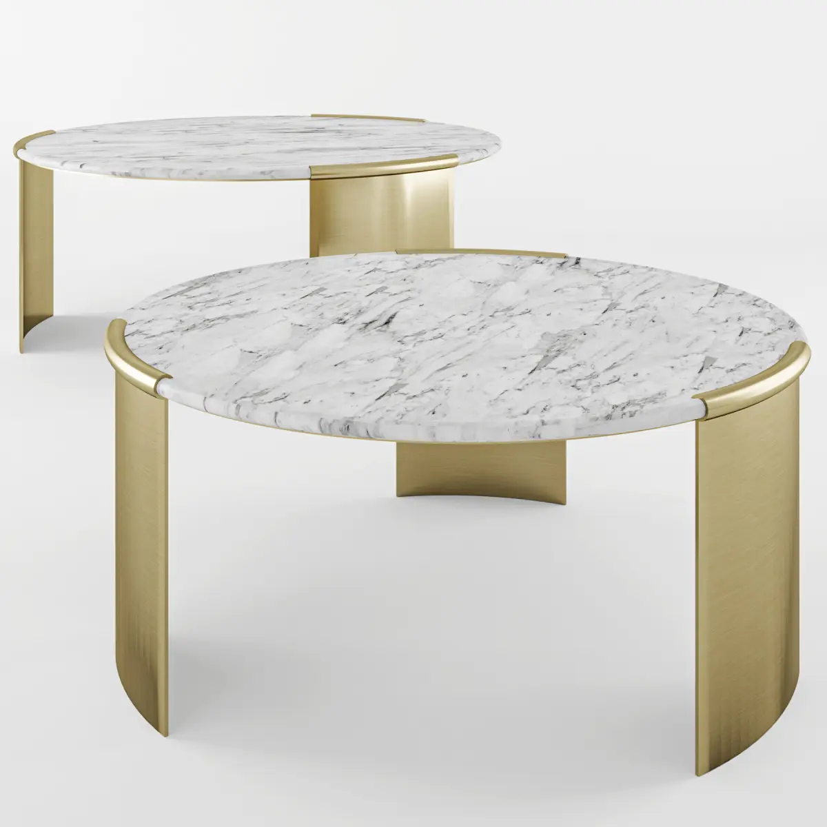 A three-legged round white Carrara marble and brass coffee table.CuratedKravet