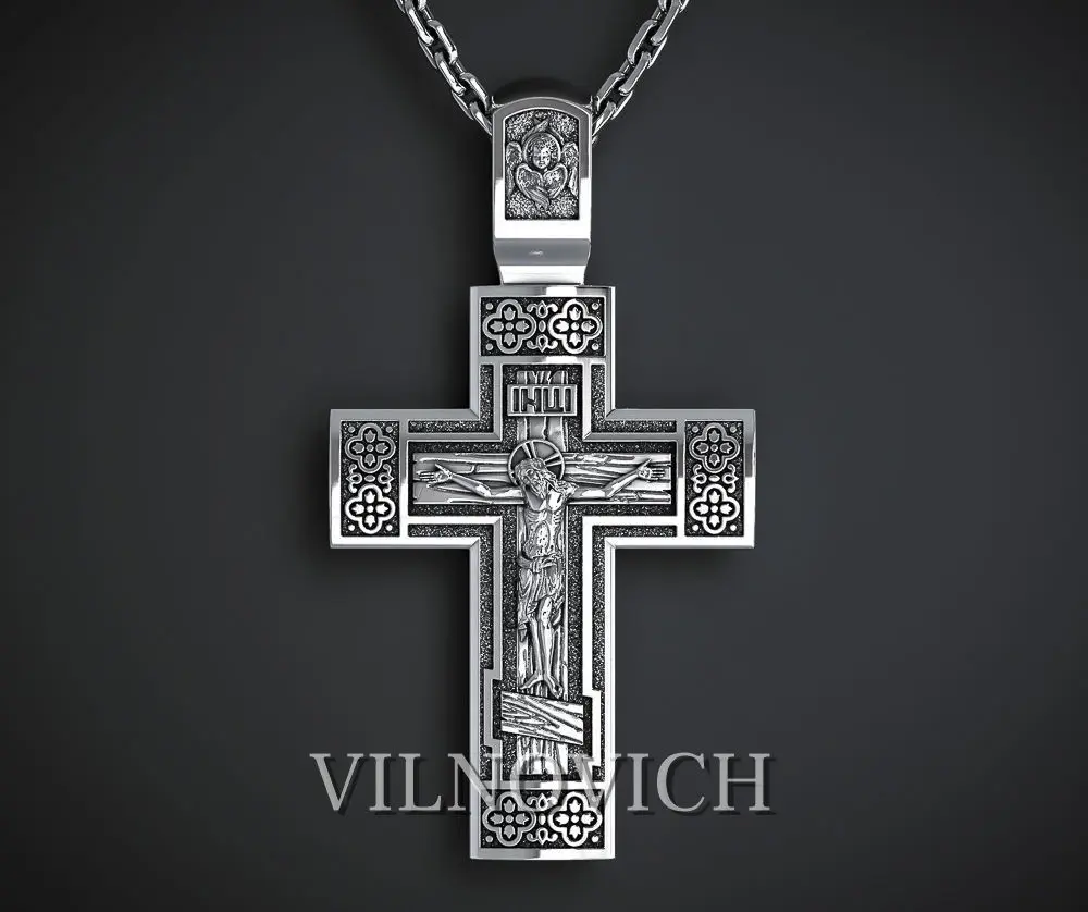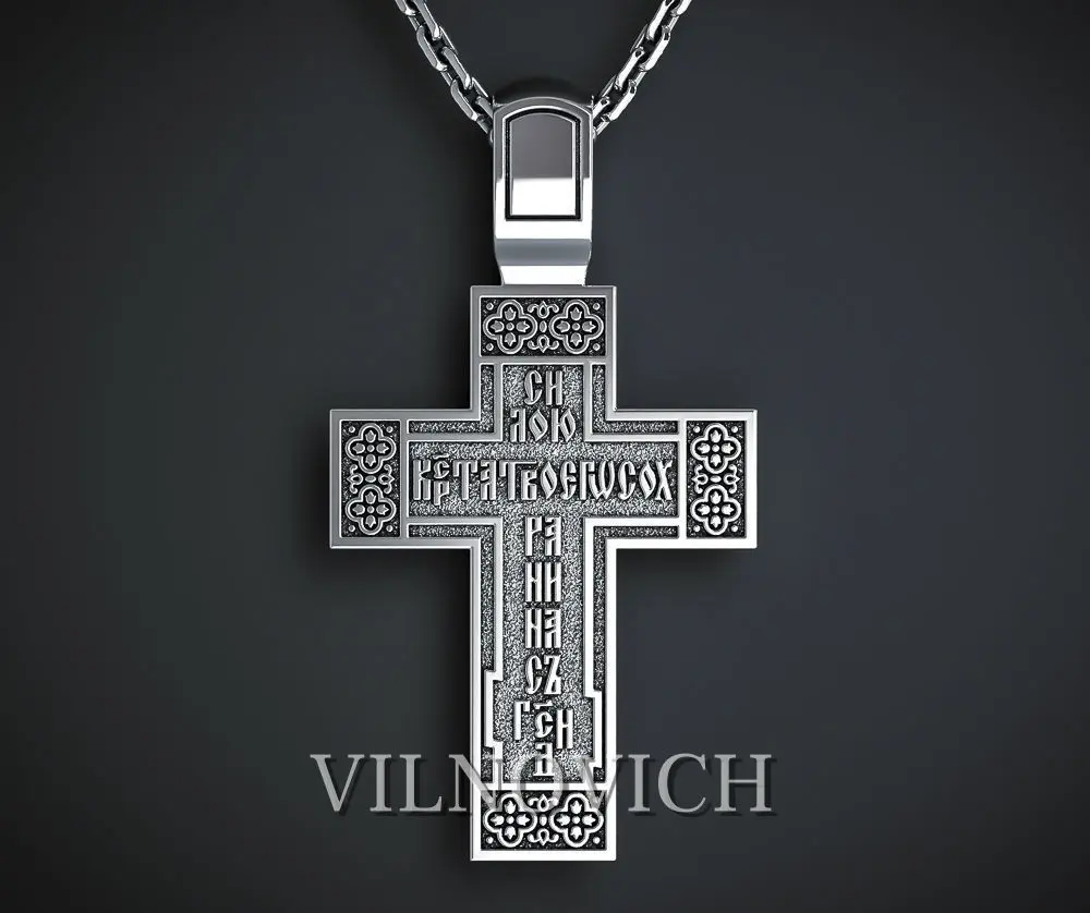An Orthodox cross with a crucifix, two-sided, with a prayer on the back.