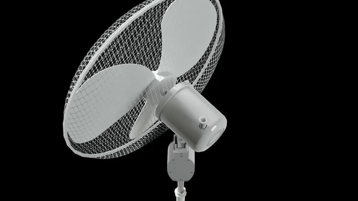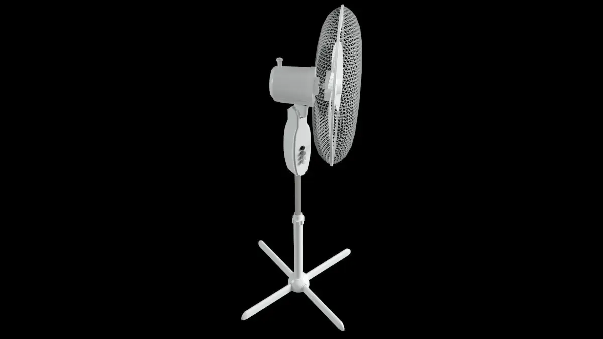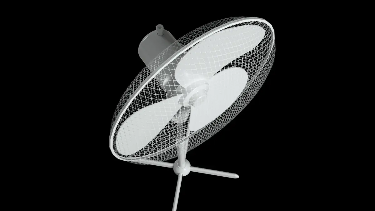 The fan slowly pans left and right while the blades spin. Additional subtle animation touches are included, such as gentle vibrations along the head and body of the appliance.