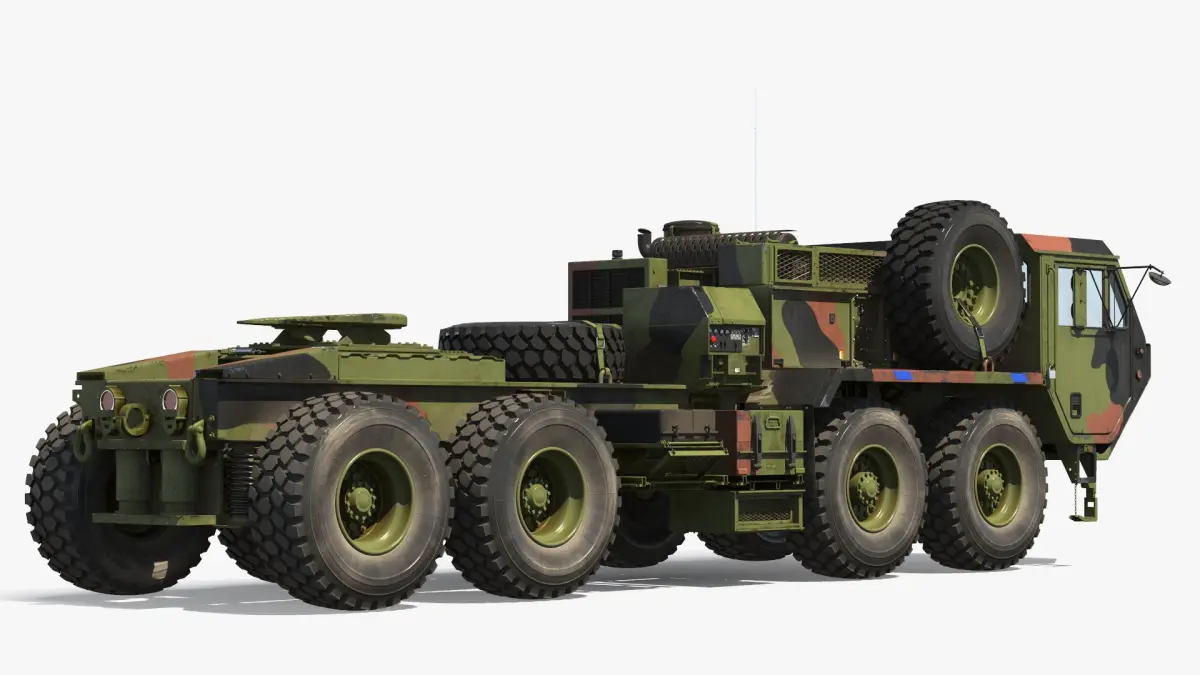Oshkosh HEMTT M985 Military Tractor with Spare Tire Camo is a 3d model of a robust military transport vehicle designed for heavy-duty operations in various terrains.