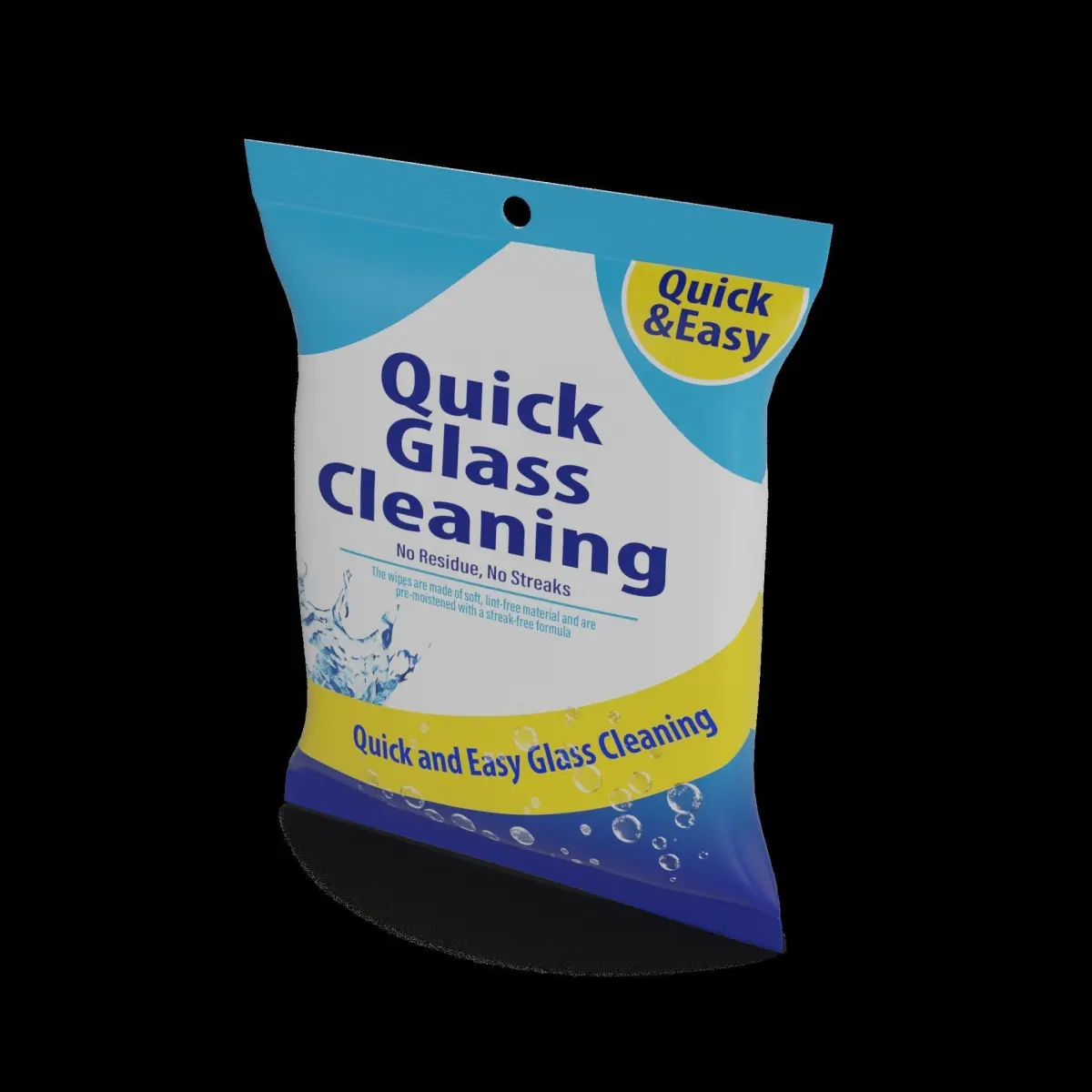 Glass Cleaner Wipes: A pack of 30 glass cleaner wipes in a transparent resealable pouch. The wipes are made of soft, lint-free material and are pre-moistened with a streak-free formula. The pouch has a colorful label with a picture of a crystal-clear window and text that reads Quick and Easy Glass Cleaning and No Residue, No Streaks. The wipes are perfect for cleaning windows, mirrors, and other glass surfaces.