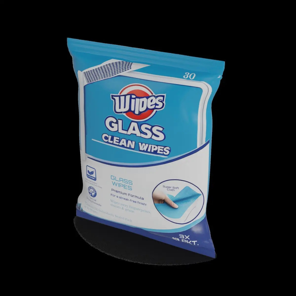 Glass Cleaner Wipes: A pack of 30 glass cleaner wipes in a resealable plastic pouch. The pouch is transparent, allowing you to easily see the wipes inside. The label on the pouch displays a sparkling clean window. These wipes are pre-moistened with a streak-free formula that effectively removes dirt, fingerprints, and smudges from glass surfaces. The pouch features a label with instructions for use and a graphic indicating that the wipes are suitable for use on windows, mirrors, and other glass surfaces.