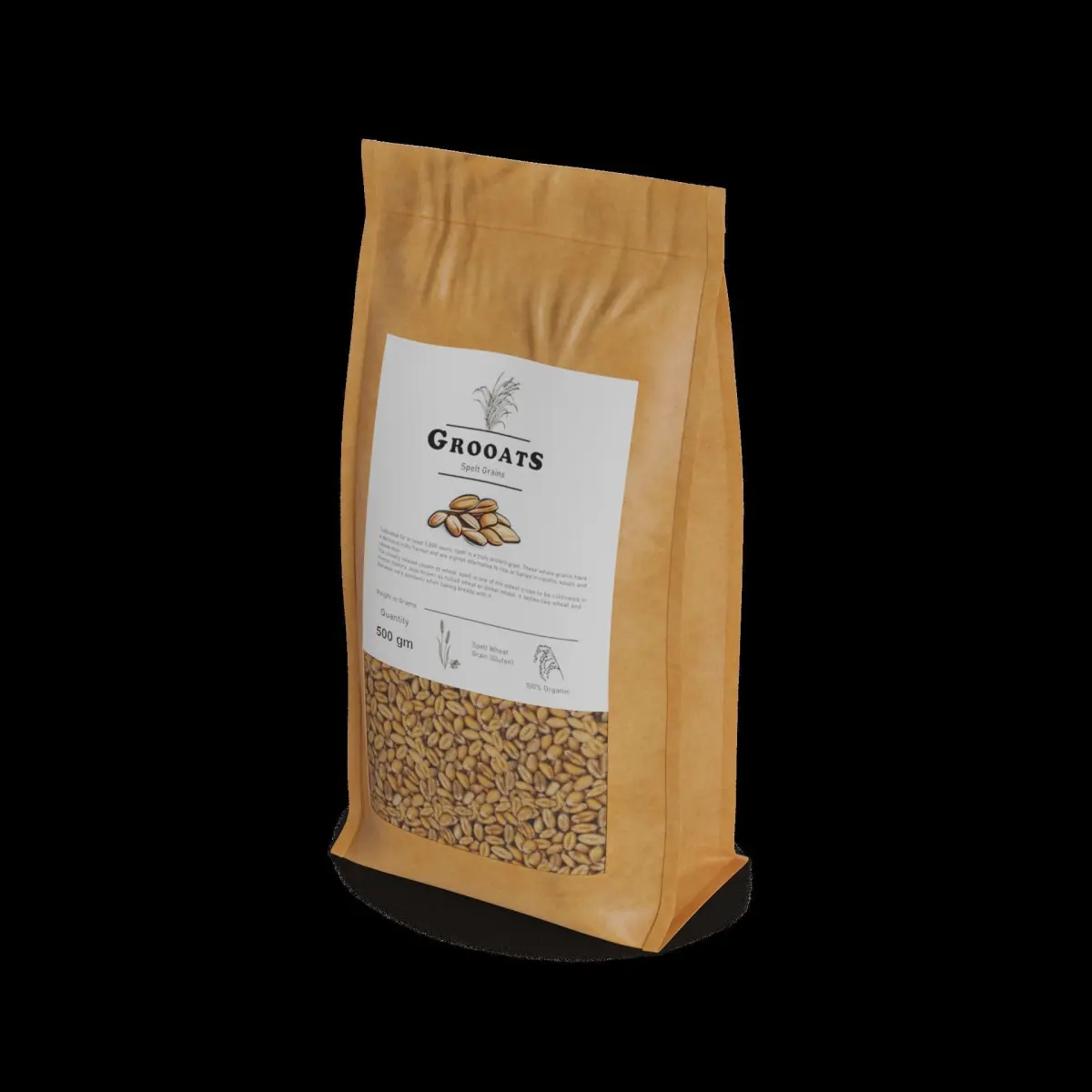 Spelt Groats: A sturdy, eco-friendly paper bag filled with light brown spelt groats. The bag has a rustic design with a hand-drawn illustration of spelt grains. The front of the bag displays the product name and a short description of its nutritional value. The groats are small and oval-shaped, offering a slightly sweet and nutty taste.