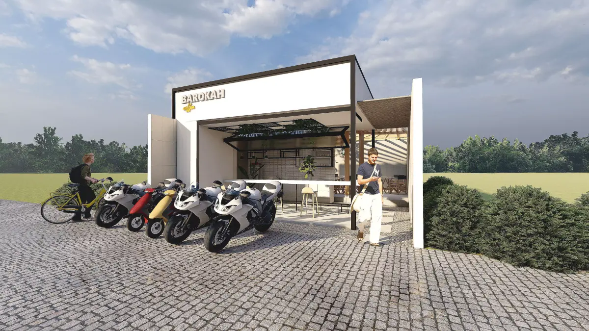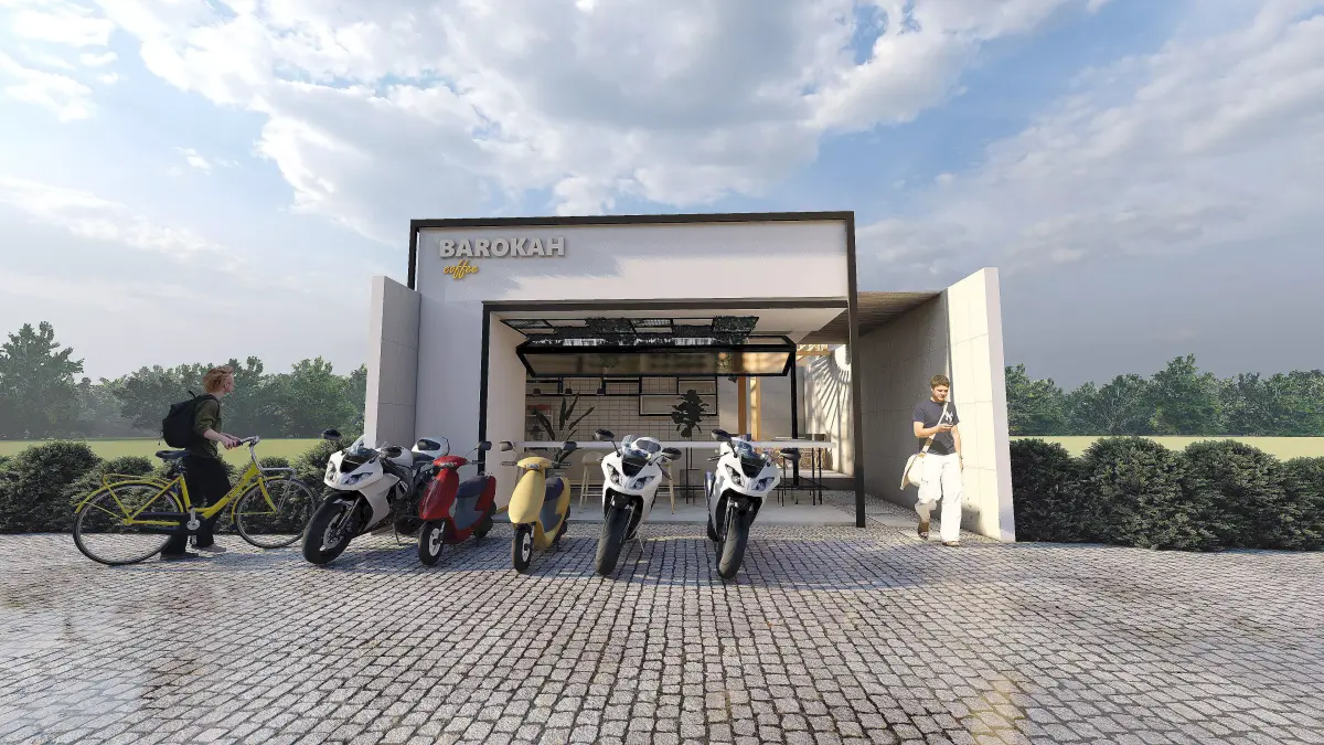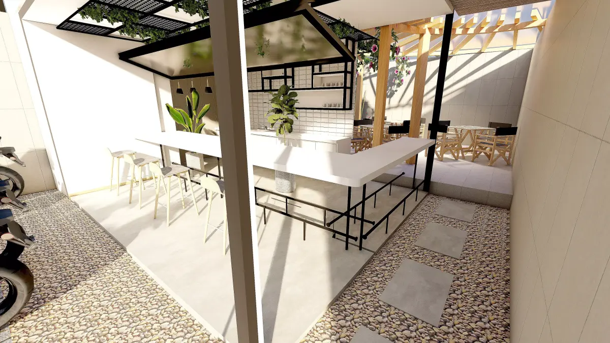 Modern outdoor cafe design with minimalist layout, perfect for small commercial spaces.This model includes: