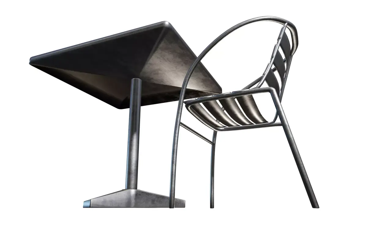 The Chair features a curved frame and a slatted seat and backrest, emphasizing comfort and contemporary design. Both the table and chair showcase a realistic metallic texture with a slightly weathered or worn look, achieved through detailed PBR maps that capture subtle imperfections and variations in reflection.