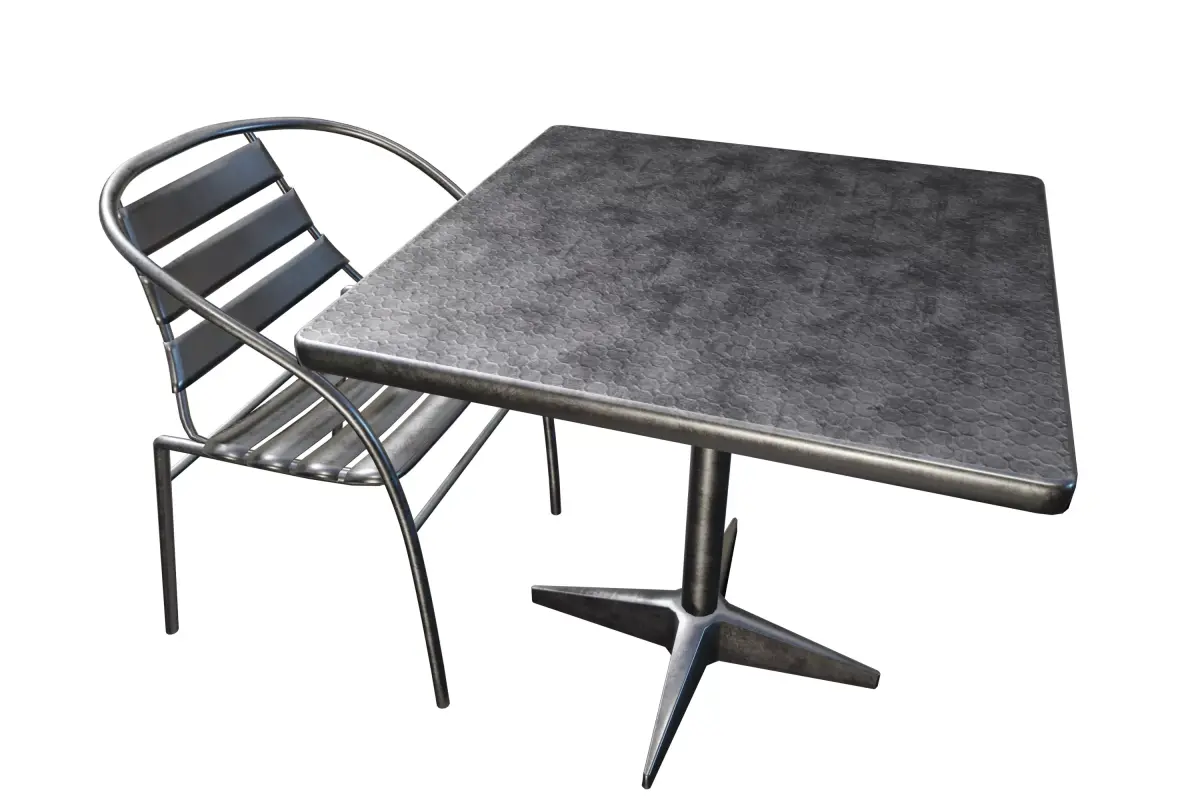 This is a highly realistic PBR (Physically Based Rendering) 3D model set of an outdoor or commercial cafe table and matching chair. The set features a durable, industrial aesthetic, constructed entirely from metal, making it ideal for high-traffic or exterior scenes.