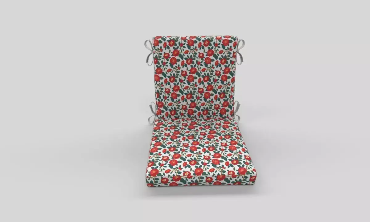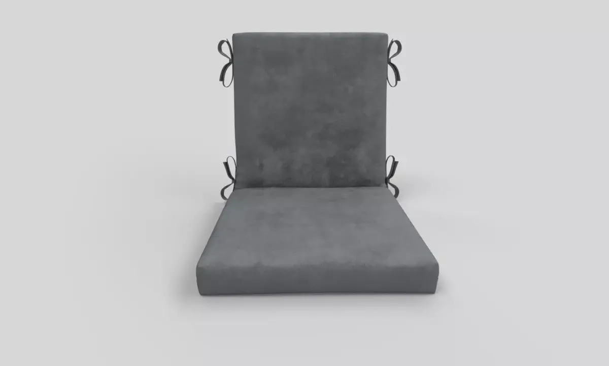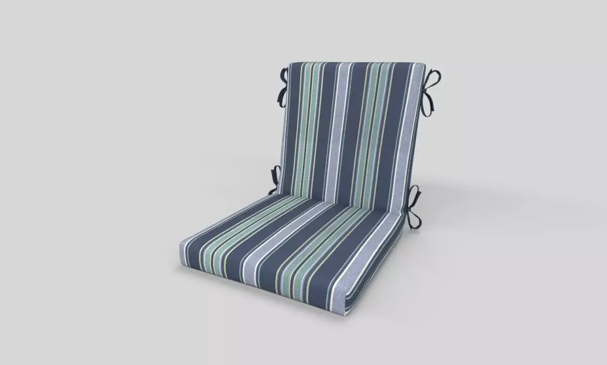 This high-quality 3D model features a comfortable outdoor chair cushion with a stylish striped fabric design in blue, green, and white tones. Designed with side ties for secure attachment, this cushion is perfect for patio chairs, garden furniture, or poolside seating.