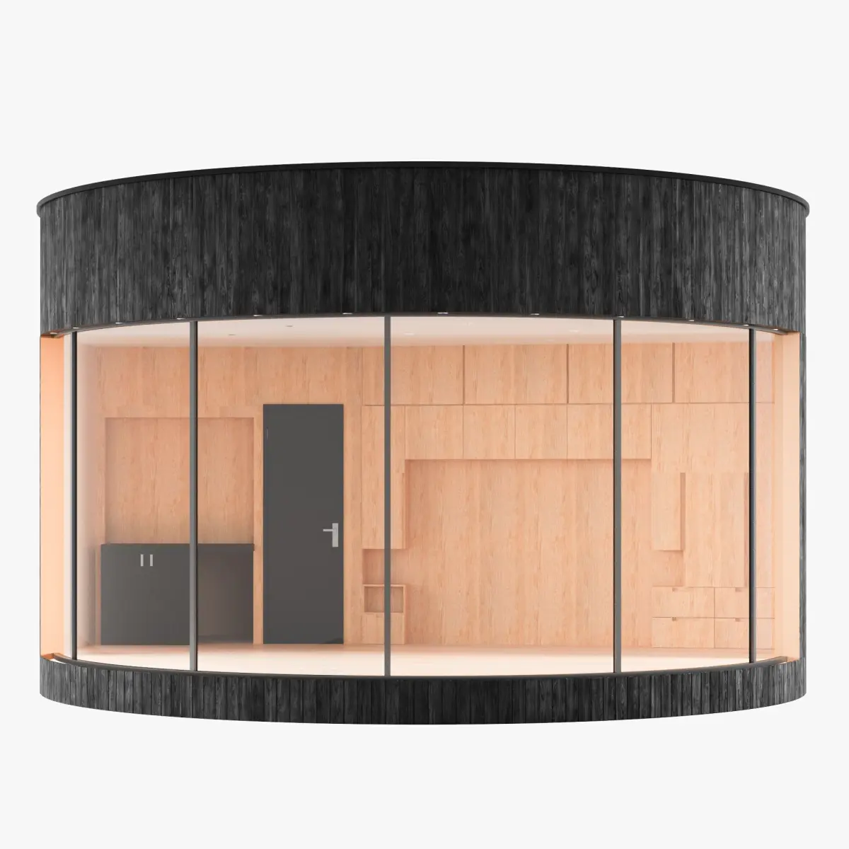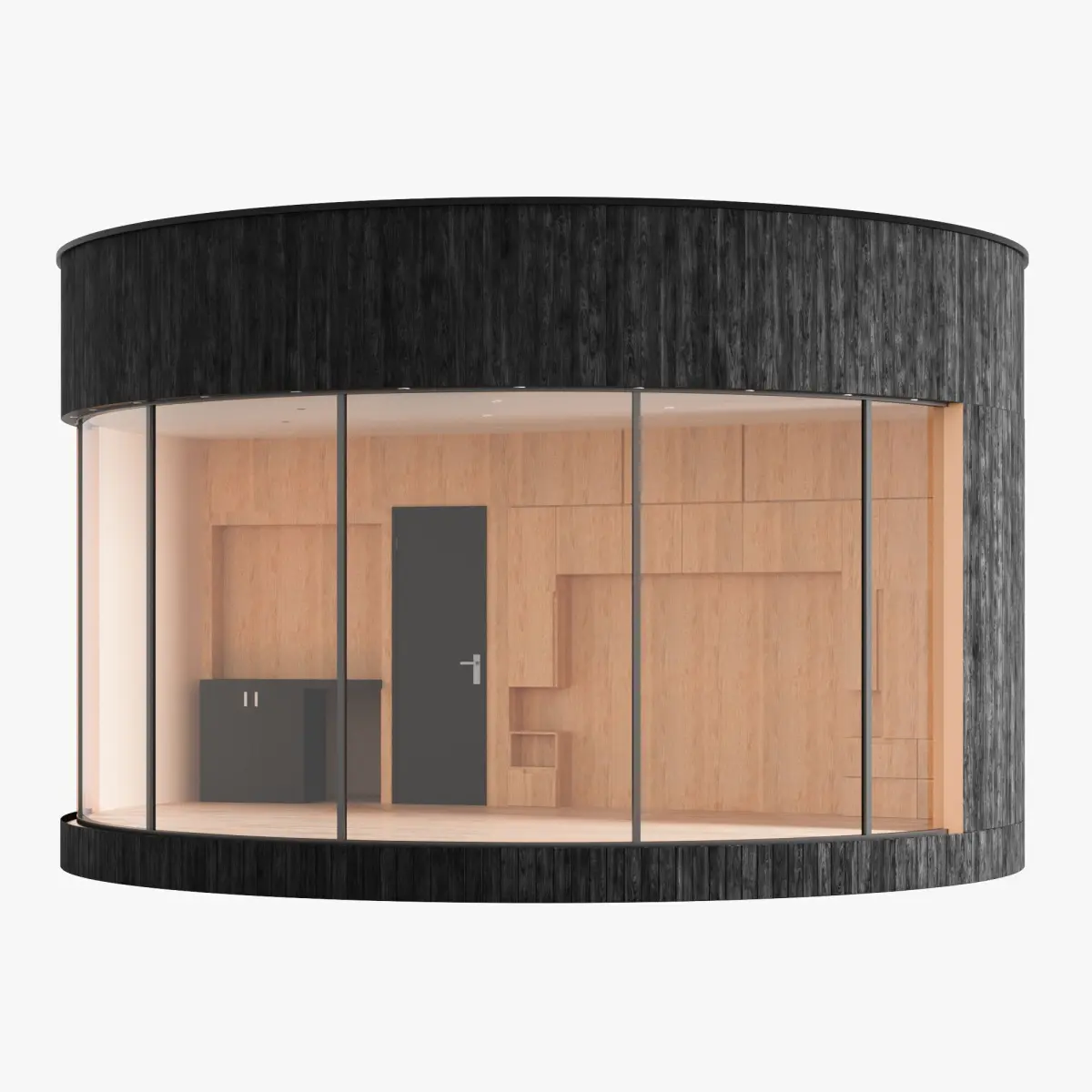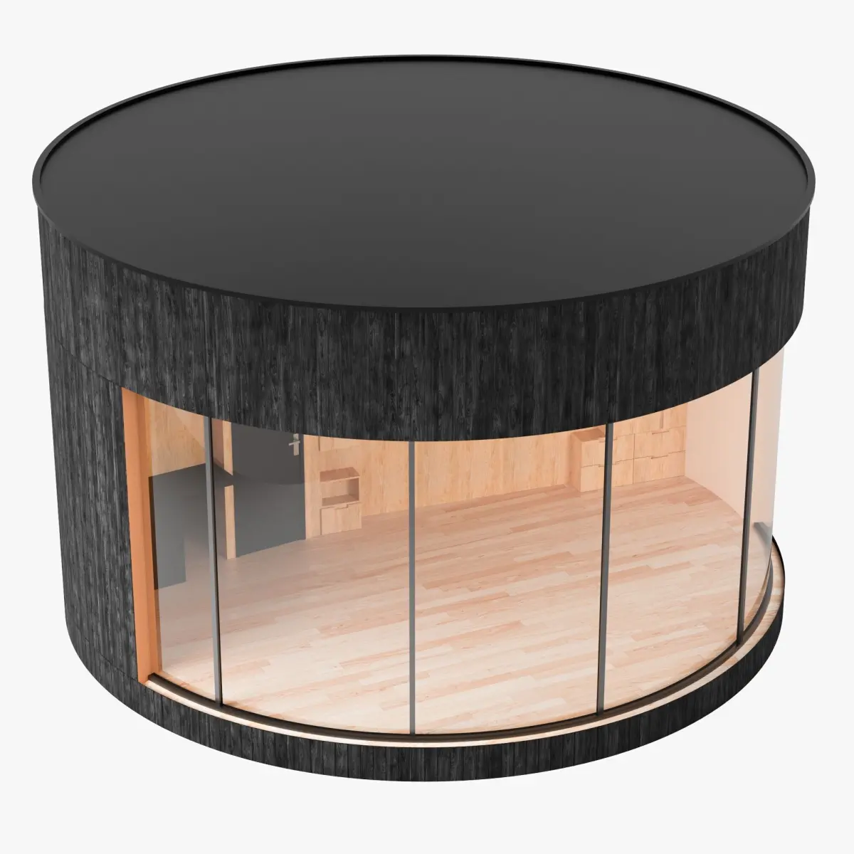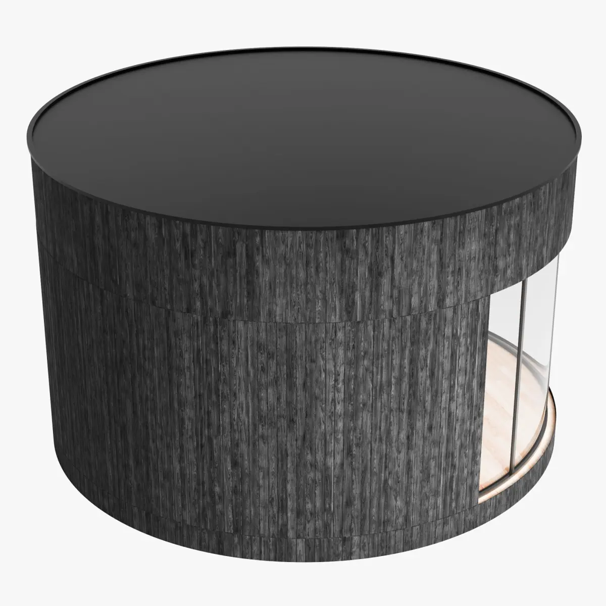 Model of a cylindrical Cabin to be used outdoors. Wooden finishes, glass window and dark grey exterior. Interior light beige wooden texture. Includes space for a bed and a kitchenette. Huge panoramic window on front.