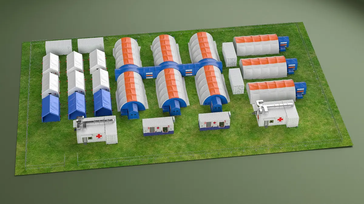 The model features a modular and transportable structure with weatherproof materials, including tents, inflatable shelters, and support units equipped for triage, patient care, and medical staff operations.