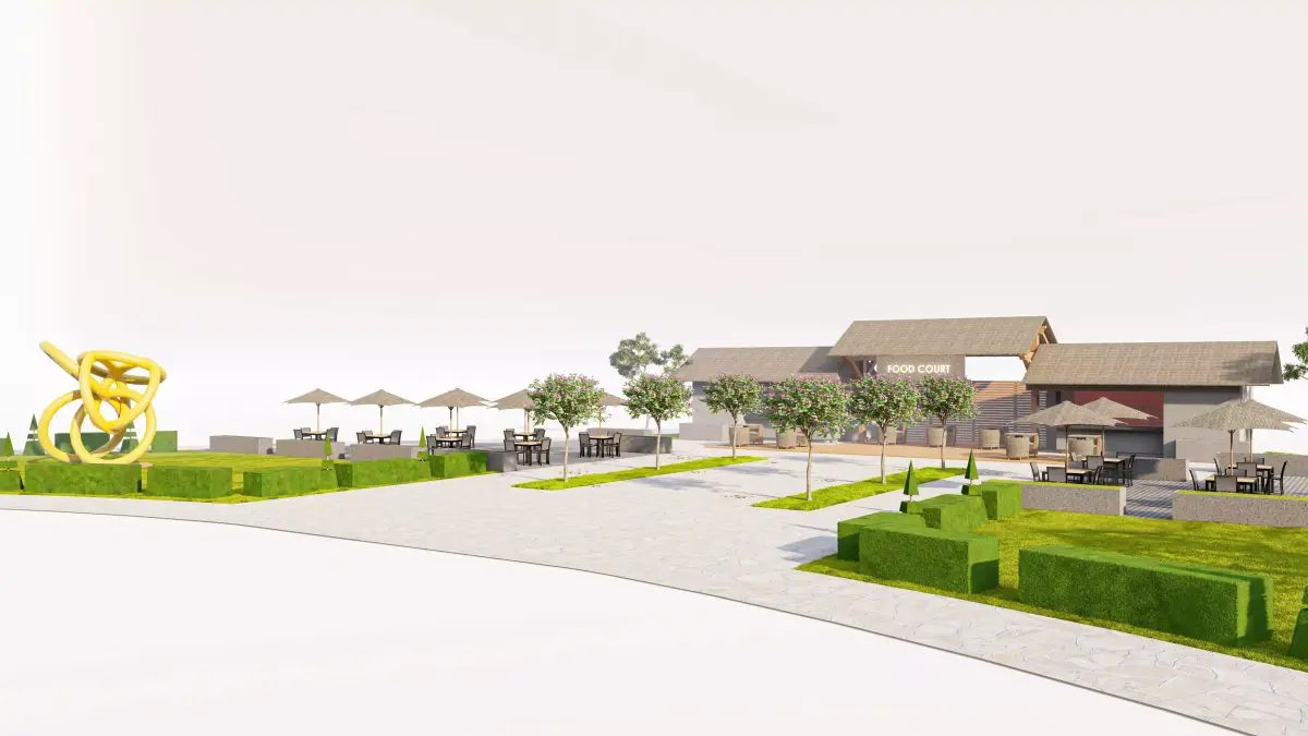 Shaded Food Court/Dining Zone: A dedicated area for casual dining, typically featuring clustered tables and chairs under a large, modern overhead shading structure (e.g., tensile canopy, architectural screen, or large pergola).