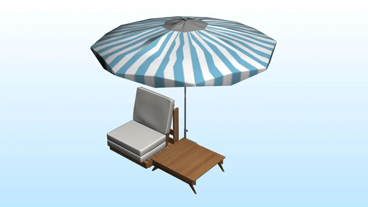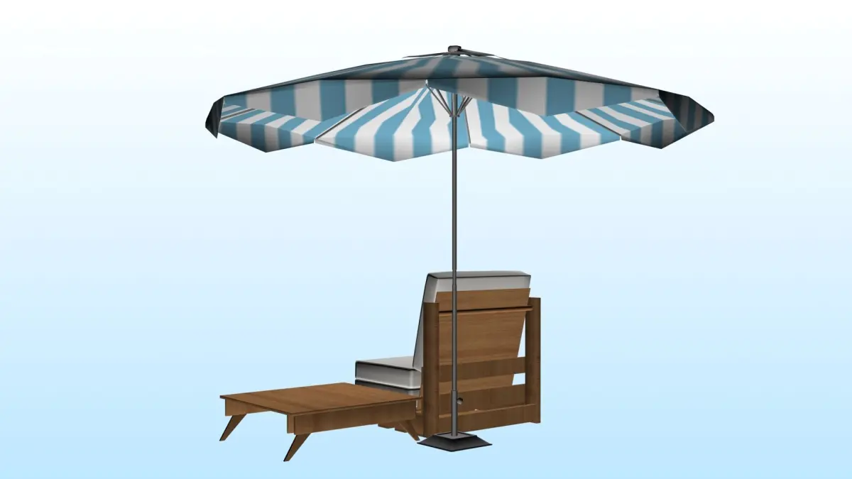 Geometry: There are a seashore umbrella, one bench and one side stool 3d models in this package.