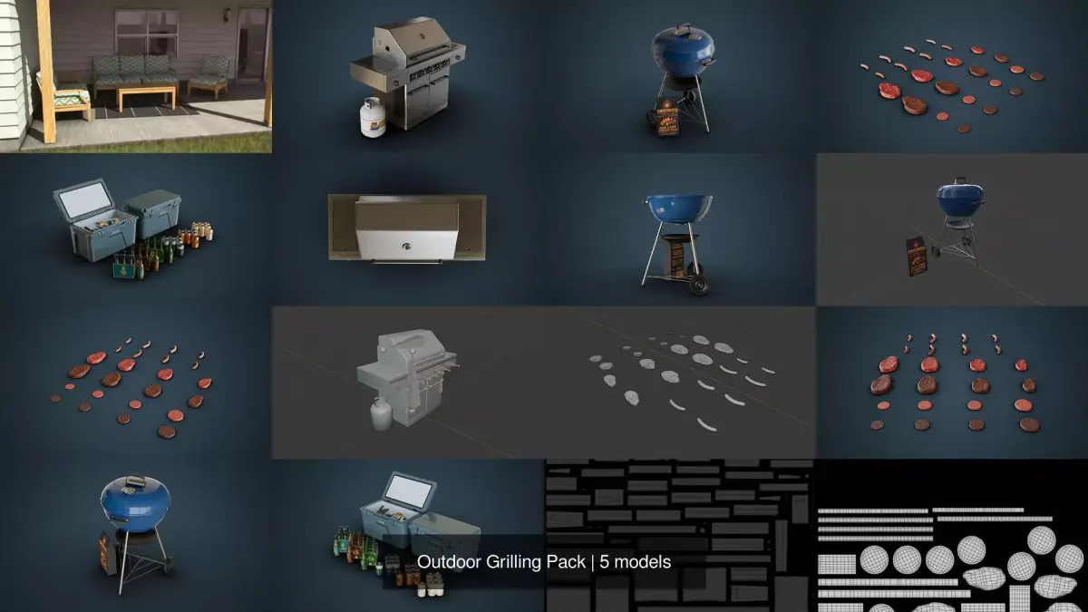 Contains:Propane Grill Propane TankCharcoal GrillBag of CharcoalPatio Furniture SetSteaks, Brats, BurgersCoolerBeer Bottles and Cans