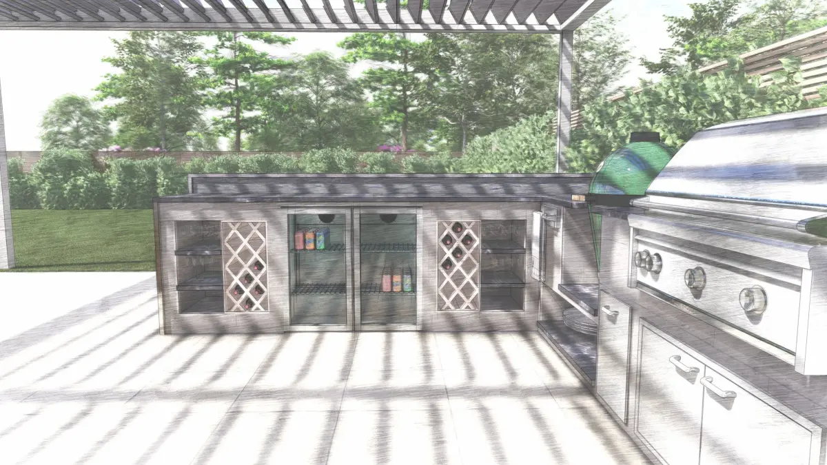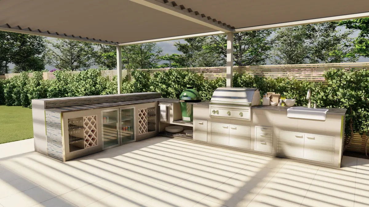 Outdoor kicthen with Gas bbq, Big green egg, Double fridge, Wine storage, Cupboards and drawers. Materials need to be set by user.